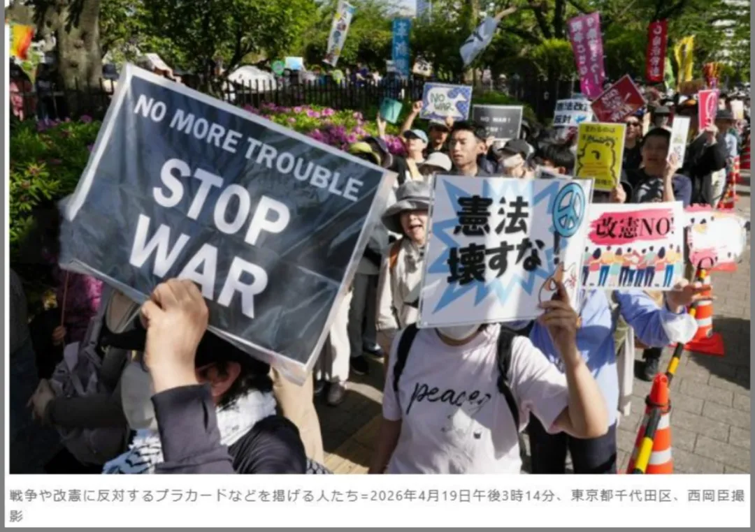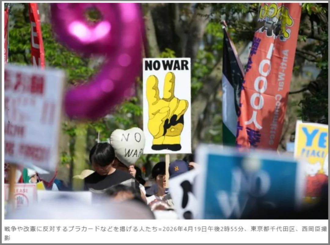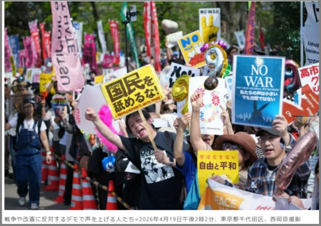 人们高举反对战争、反对修宪的标语牌等物品=2026年4月19日下午2时55分,东京都千代田区,西冈臣摄