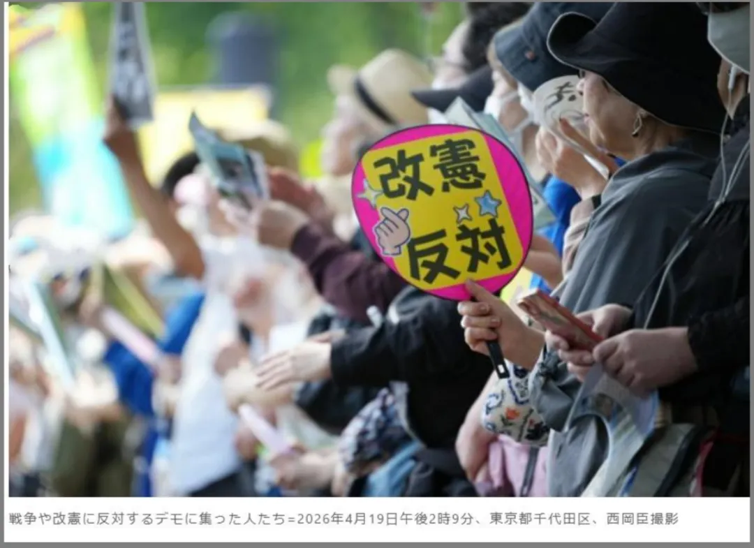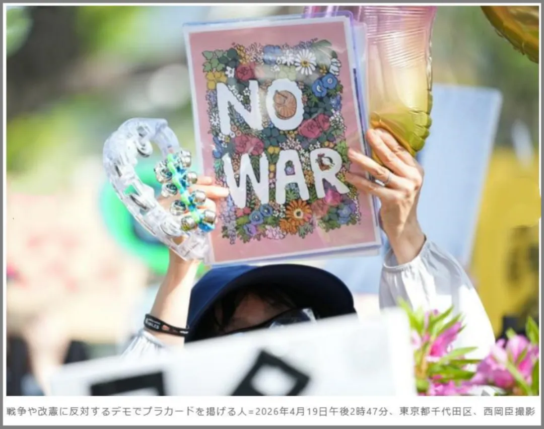 在反对战争及修宪的游行示威中高举标语牌的民众=2026年4月19日下午2时47分,东京都千代田区,西冈臣摄