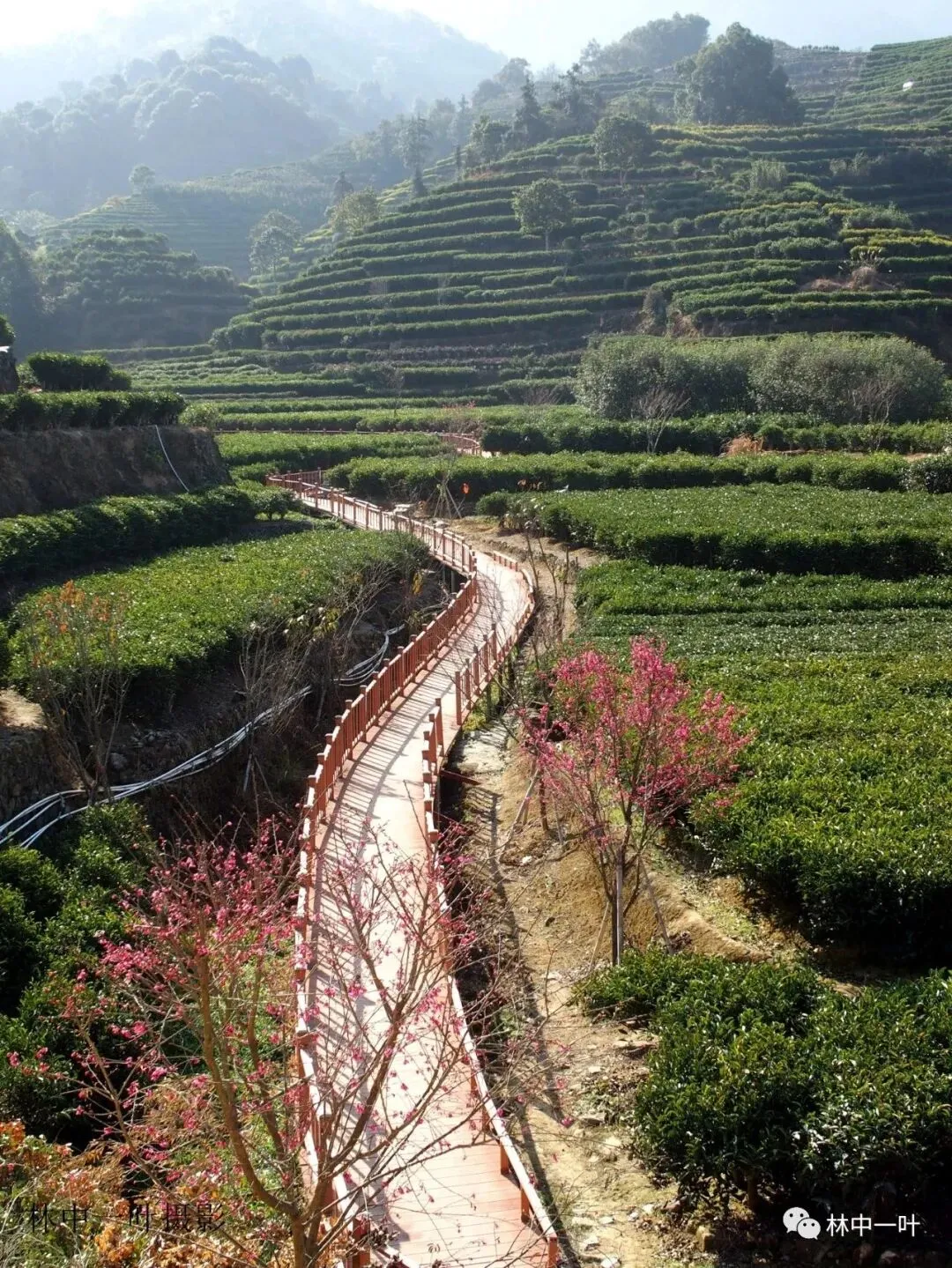 棋盘村樱花栈道位于潮安区凤凰镇棋盘村,是凤凰茶旅小镇的项目之一,栈道沿着该村的溪流铺设,全长约1公里,两侧点缀种植了约350棵樱花树,蜿蜒穿过茶园,春季樱花盛开时,与远处的青山、近处的茶芽相映成趣,构成了一幅秀丽的春日山水画卷。游客身处栈道之中,既可以近距离欣赏樱花之美,又可以感受茶园景色,茶叶香气。
