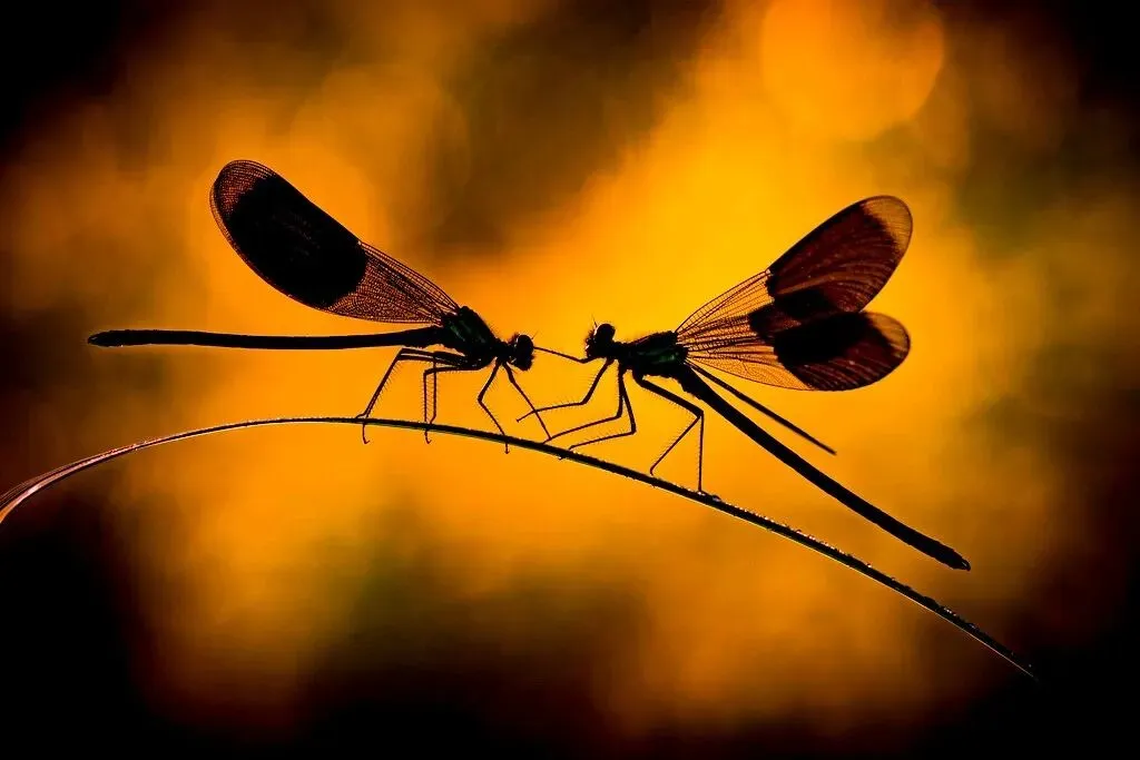 暮染金波映翅轻,双蜓相偎立柔茎。