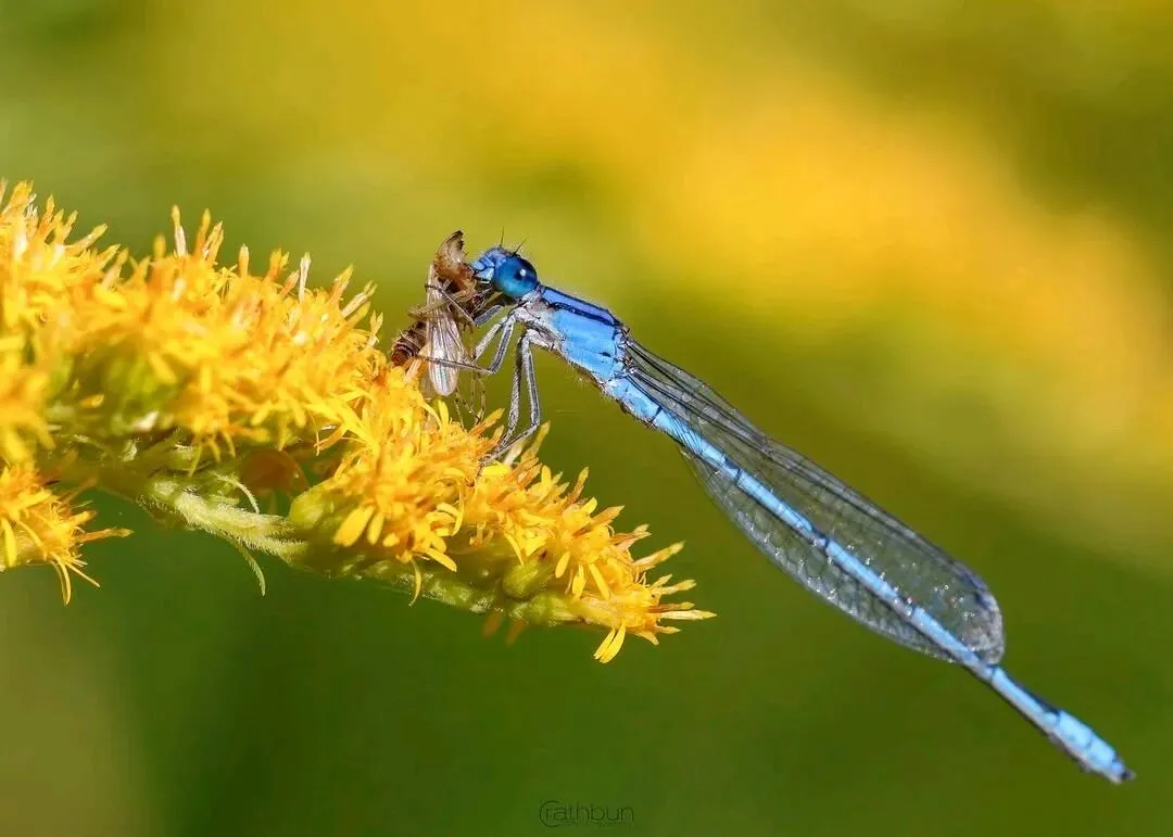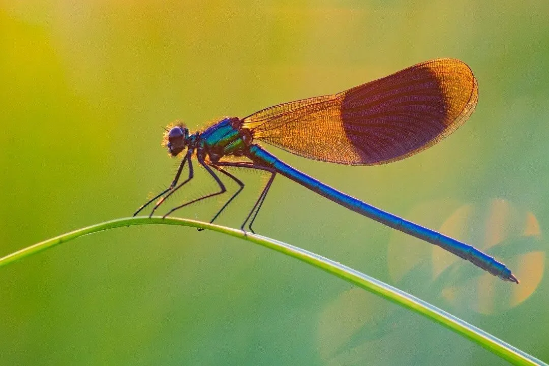 翠脊蓝躯映晓晴,薄翼斑斑染金明。