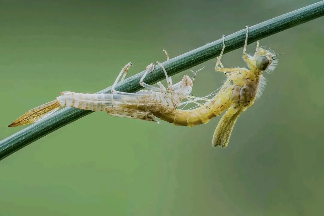 蜕尽残躯生羽翼,轻攀翠秆待晨曦。