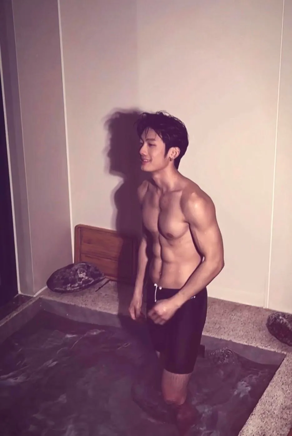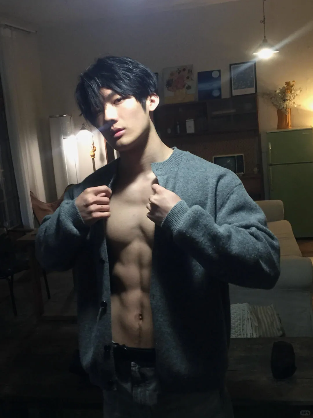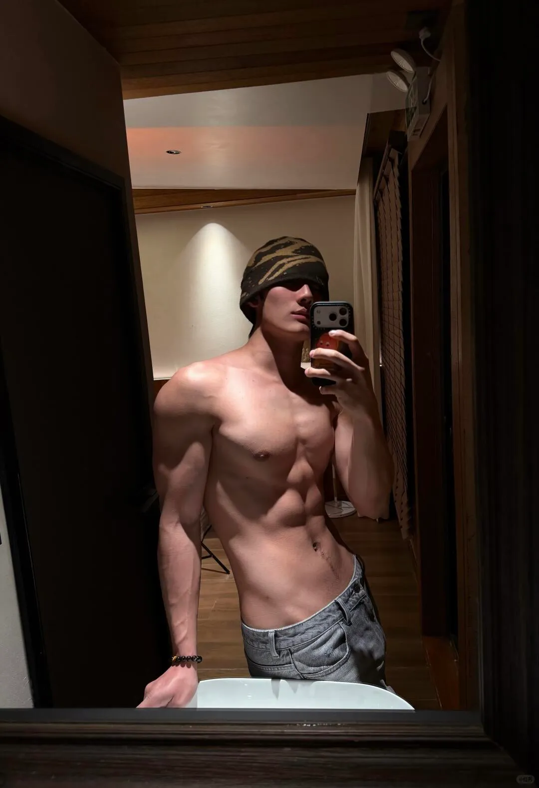 他这个身材应该已经不能算是薄肌了吧?小哥哥宽肩、细腰,他的体脂也不高,腹肌也是挺明显的。