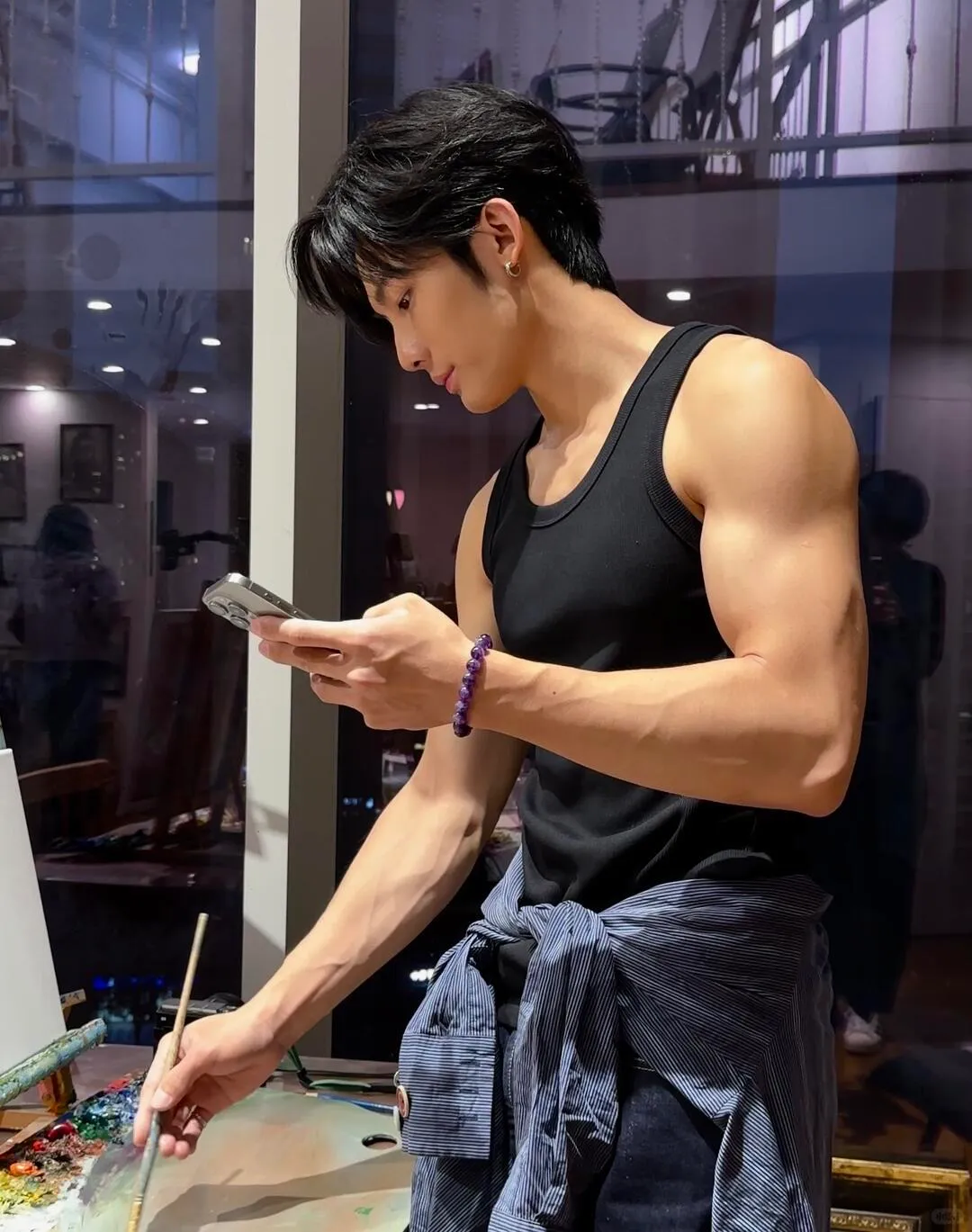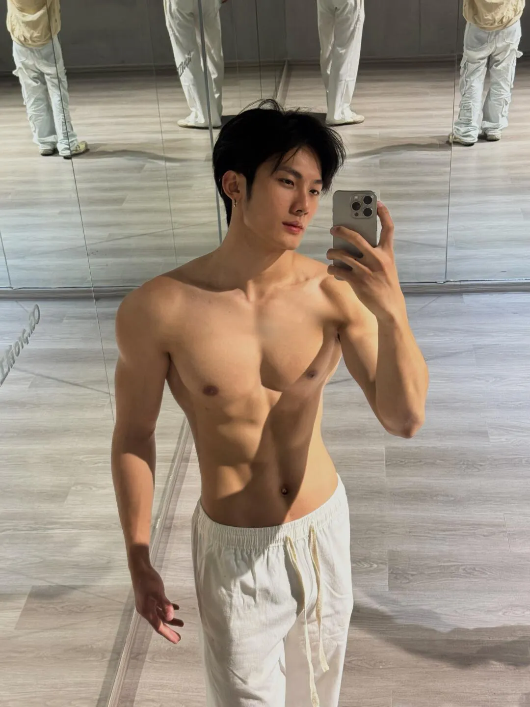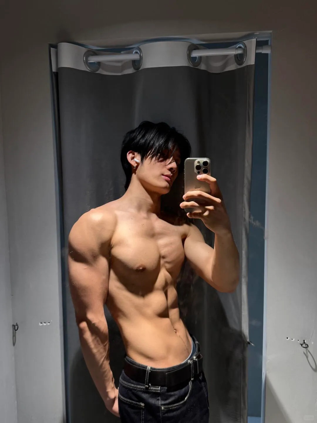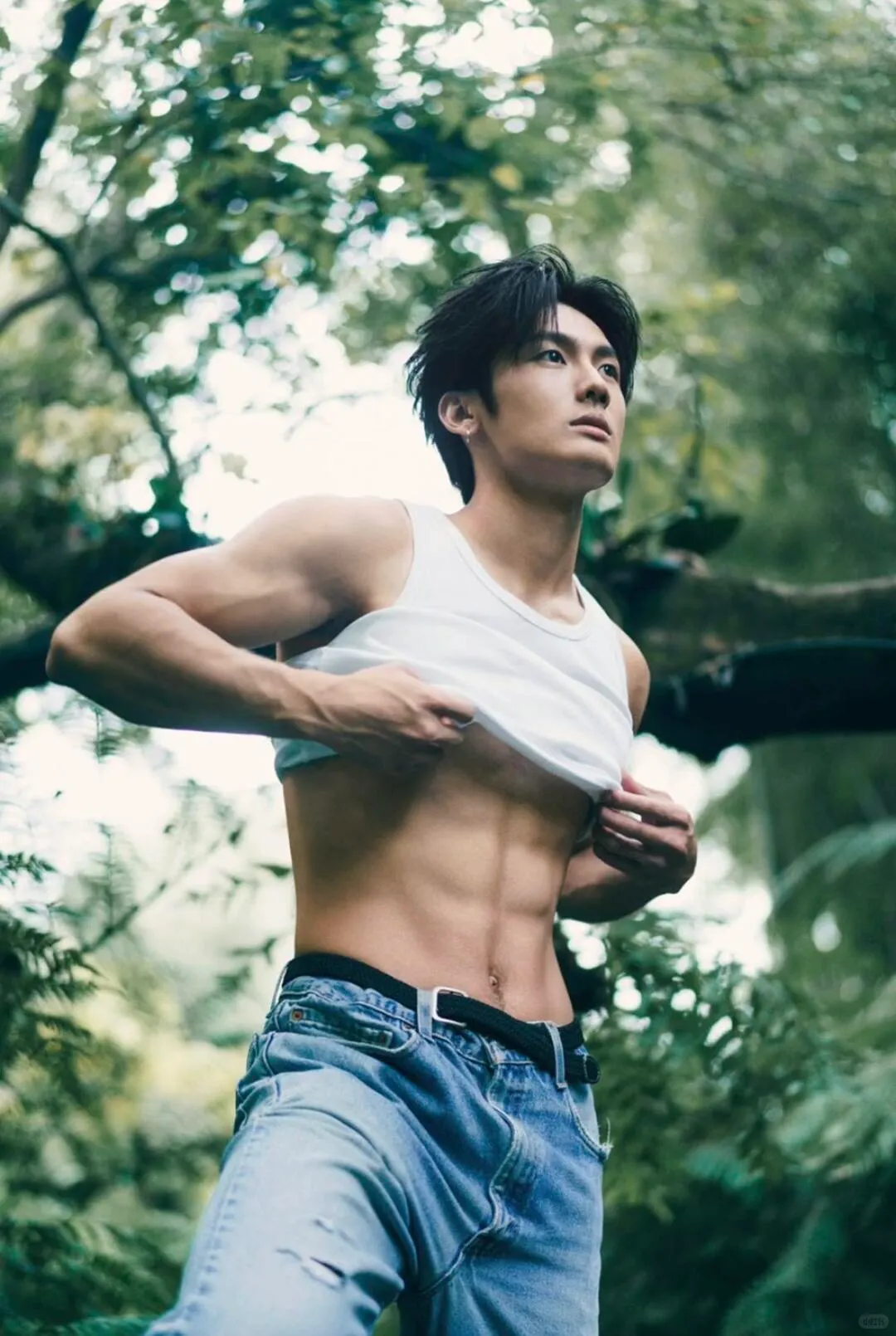 他这个身材应该已经不能算是薄肌了吧?小哥哥宽肩、细腰,他的体脂也不高,腹肌也是挺明显的。