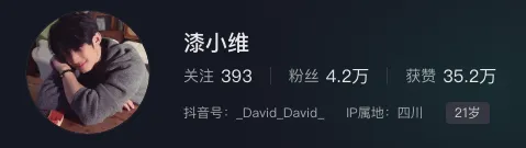 小哥哥在抖音上的昵称和小红书上就是相反的,叫做漆小维。在抖音上,他的粉丝多了不少,小哥哥凭借着 40 个视频就斩获了 4.2 万的粉丝。