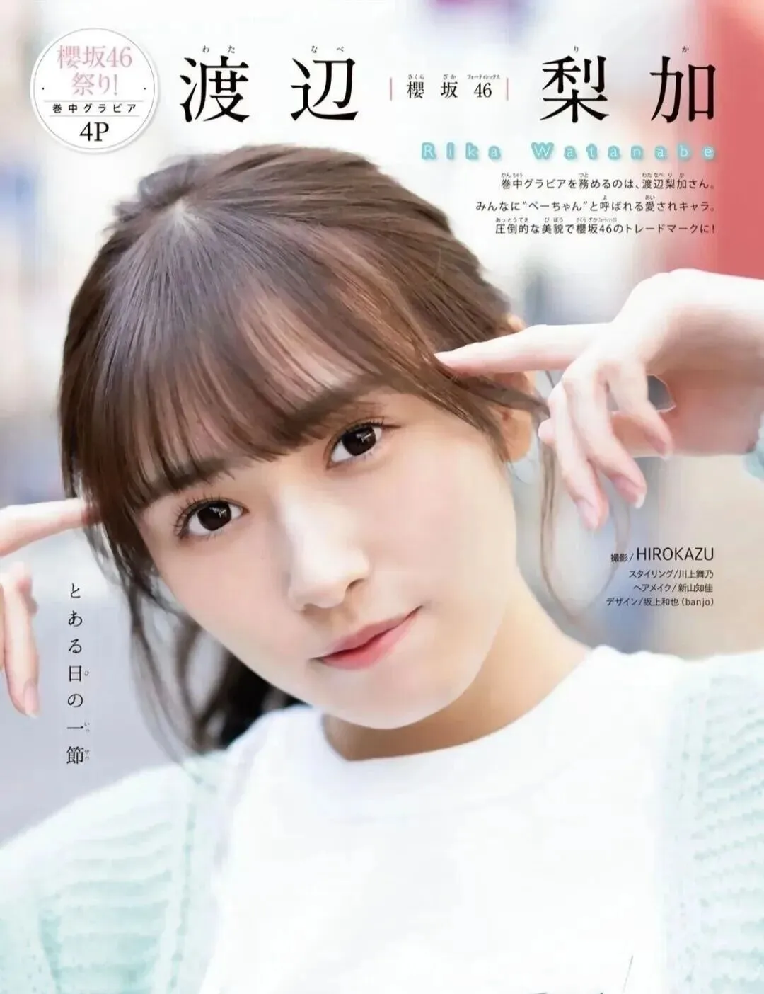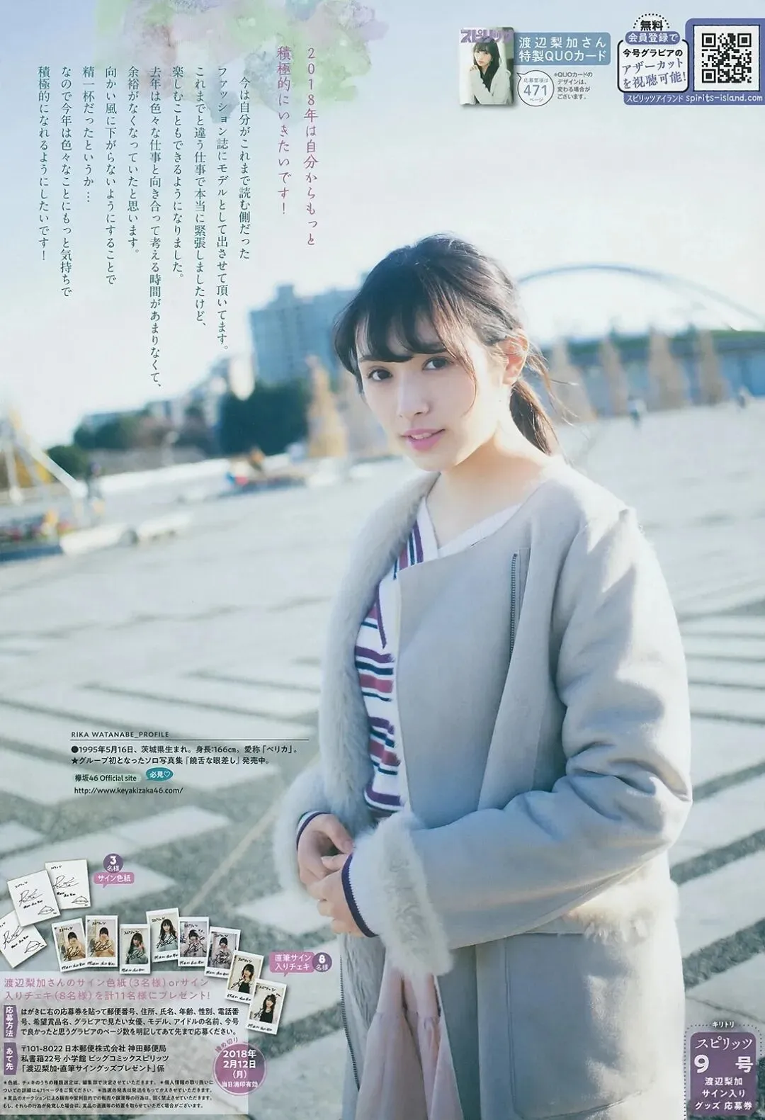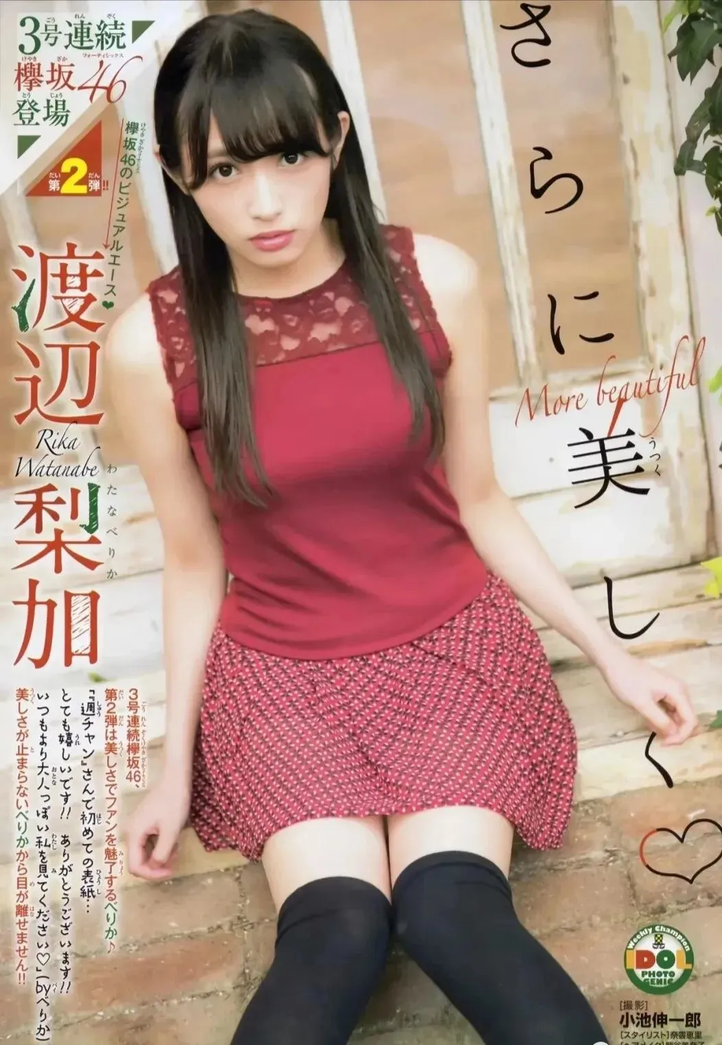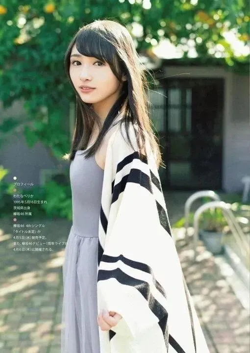 渡边梨加,1995年5月16日出生于日本茨城县,O型血,身高166cm,妥妥的金牛座美女。20岁读短大时,她在妹妹劝说下参加欅坂46一期生甄选,从2万2千多名竞争者中脱颖而出,2016年随组合以单曲《沉默的多数派》正式出道。