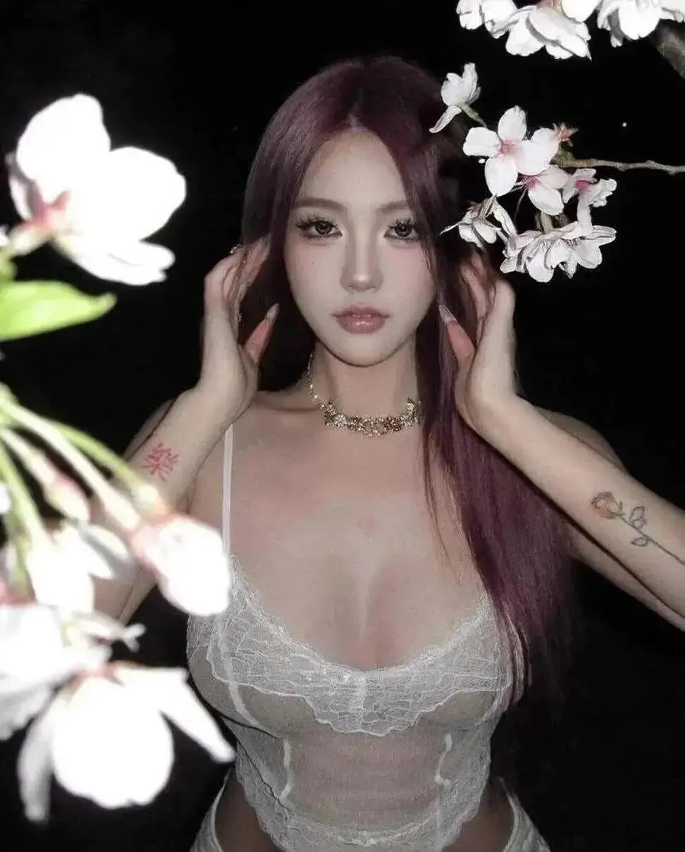 为什么好看: 双手上移后,脸会被自然“框”住,特别适合拍特写。夜拍搭配花枝前景,会让照片更有层次;白色蕾丝上衣本身就偏温柔风,用这个动作能把细节和氛围都拍出来。