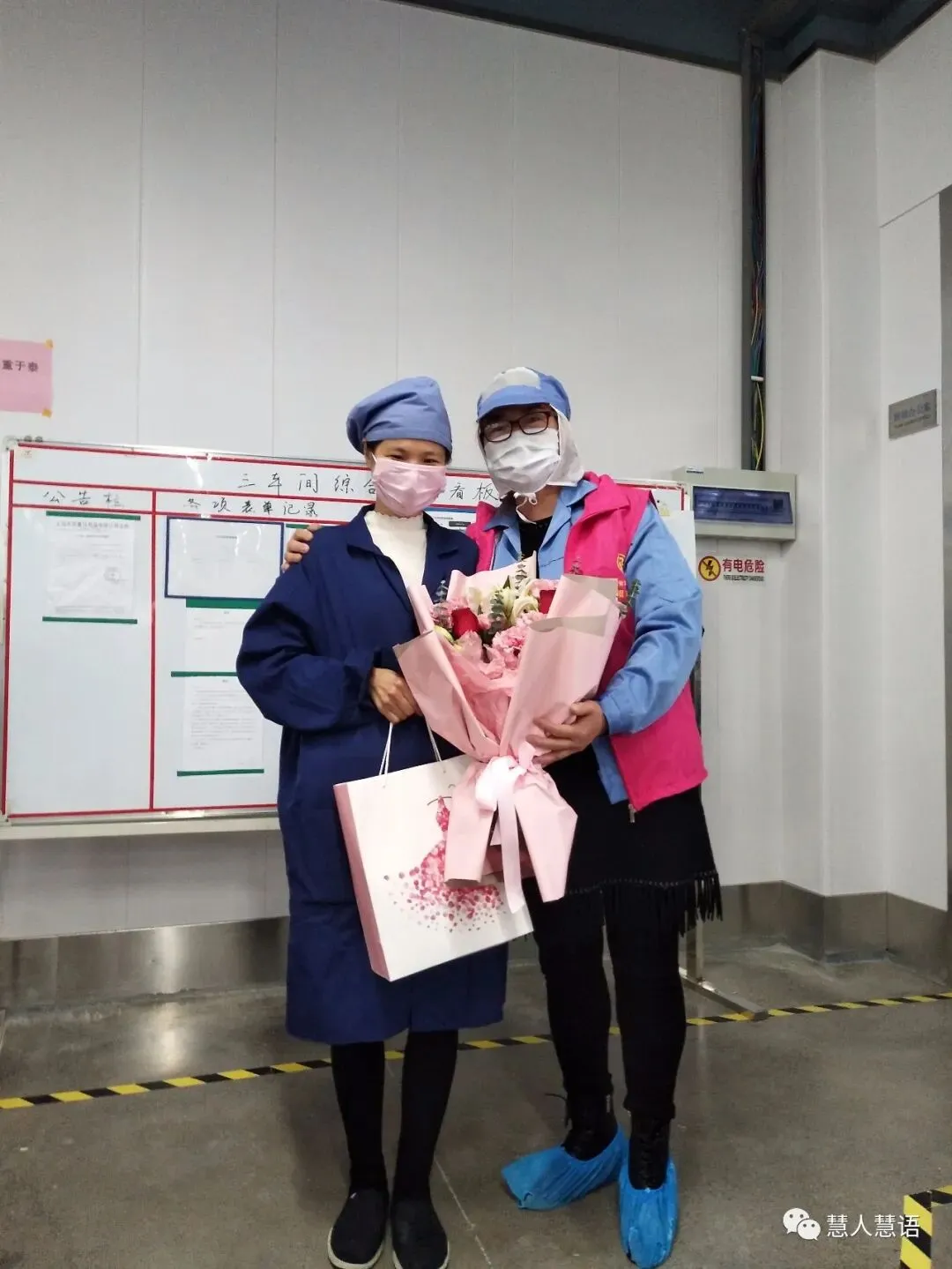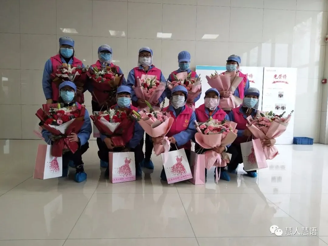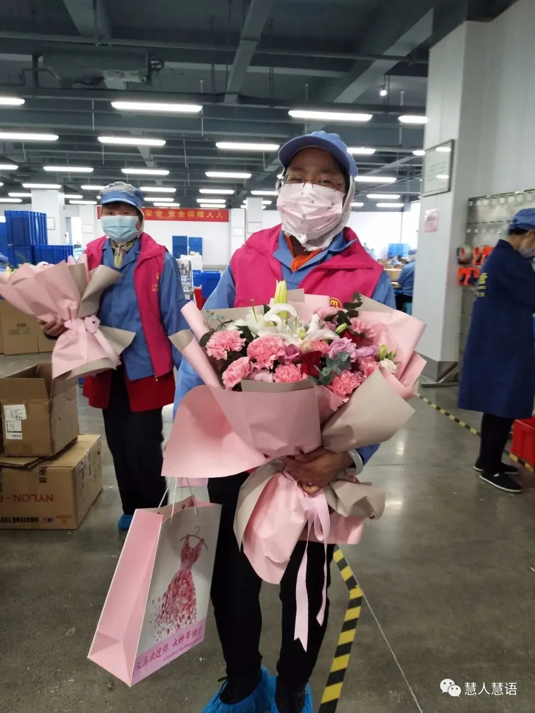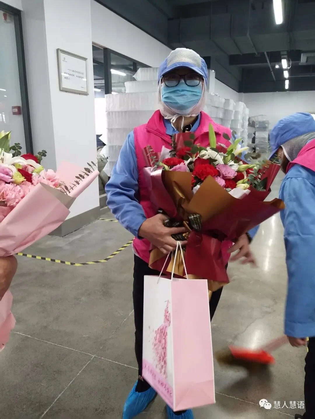 看到鲜花和礼物,我们才意识到原来今天是一年一度的女神节呀!收到礼物的巾帼志愿者们各个眉开眼笑,仿佛这场疫情从未来过。因为着装关系,大家可能无法从照片中直接看清楚,但是当时的气氛在场的每个人都可以感受到。这注定是一个不一样的女神节!