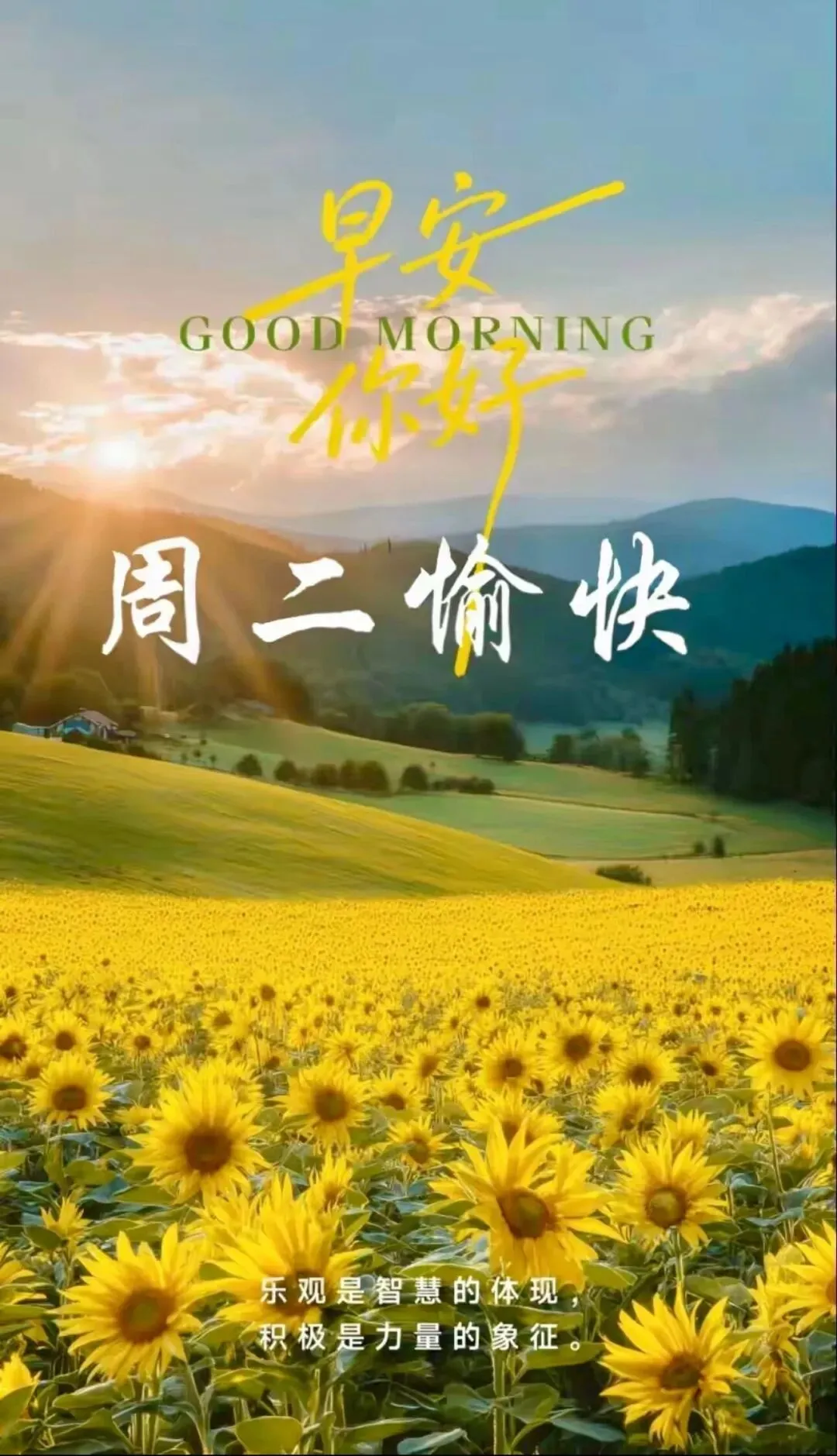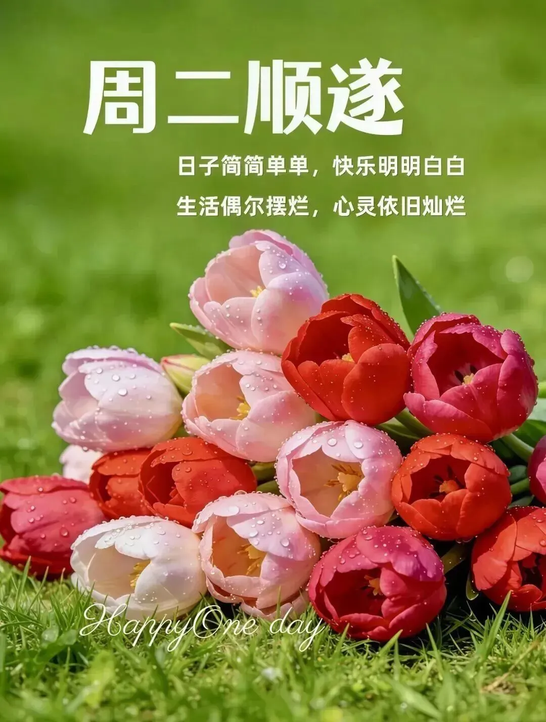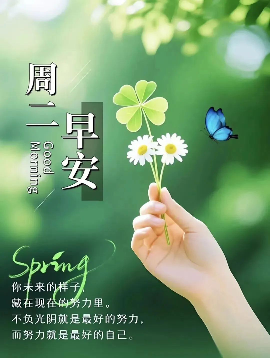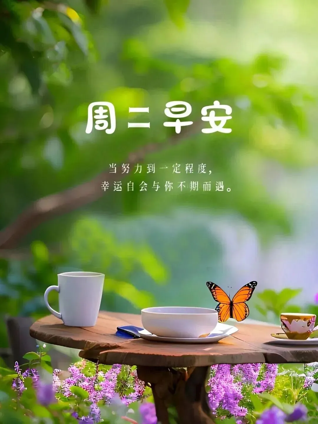 6、眨眼就是一天,转瞬即是一年。珍惜每个瞬间,过好每个今天。问声朋友早安,快乐伴随身边。新的一天,祝愿大家:工作顺心如愿,生活幸福温暖。早上好,周二快乐!