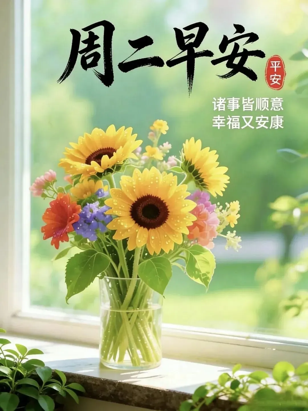 9、每天,用纯真的心,去问候珍惜的人。用满满的祝福送给牵挂的人!健康,快乐,平安!早上好,周二快乐!