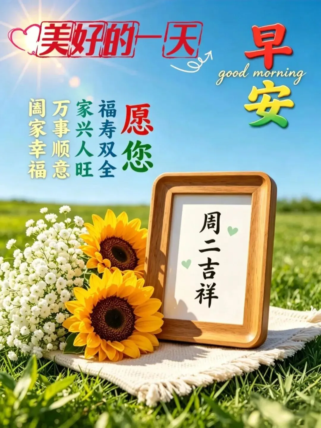 周二清晨☀️,阳光正好🌤,微风不燥🍃。愿您放下琐事🙂,放宽心情❤️,晨起多活动🚶,三餐吃得香🍚。保持好心态👍,平安又健康💪,舒心过好每一天✨,周二吉祥!新的周二🌞,新的开始🌟。岁月虽匆匆⏳,心态要从容☺️。愿您晨起精神好😌,午后多休息🛌,少操心多开心😄,身体硬朗💪,笑容常在😊,平安喜乐常相伴🎋。