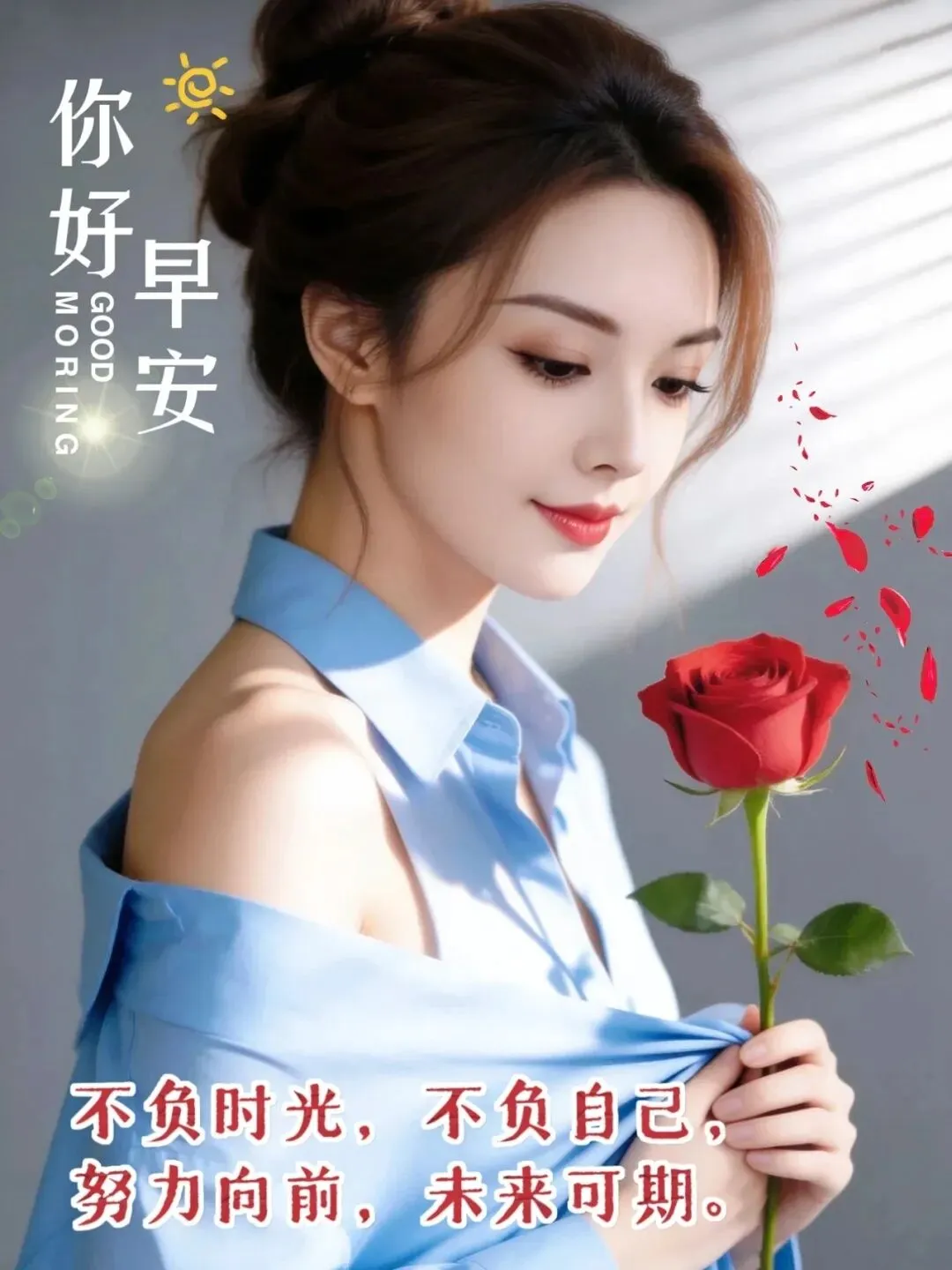 3. 早安!走过无数昨天🌙,珍惜每个今天☀️。太阳初升🌅,阳气满满💪,睡足起身🛌,迎接朝阳☀️。心宁体健🧘,膳食营养🍲,工作顺心💼,家人安康,日子温暖,岁岁吉祥,一路向阳。