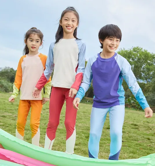 这款其实就是上面短款泳衣的加长版,只不过这款做了分体式长袖长裤的款式,更适合孩子夏天在户外玩水时穿,对手臂、腿的保护更周全