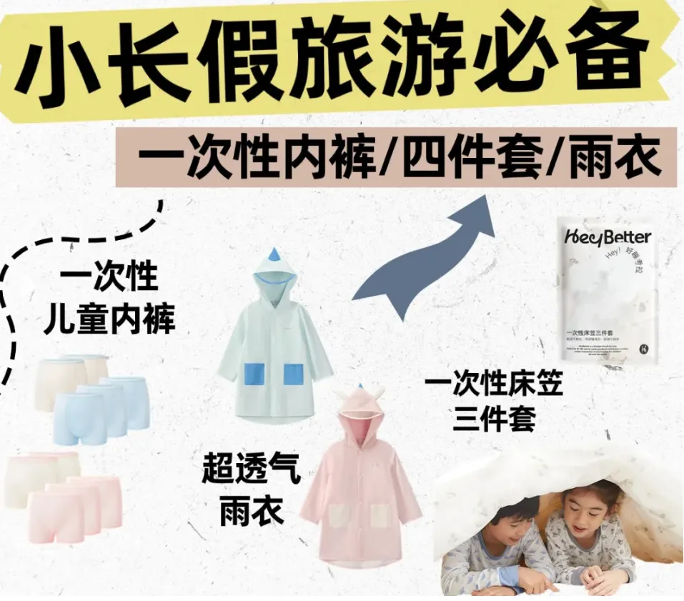 还有专门为后面暑期,端午小长假准备了春夏旅游必备单品:天丝做的一次性奢华日抛裤,和旅行一次性四件套,还有雨季必备的雨衣。