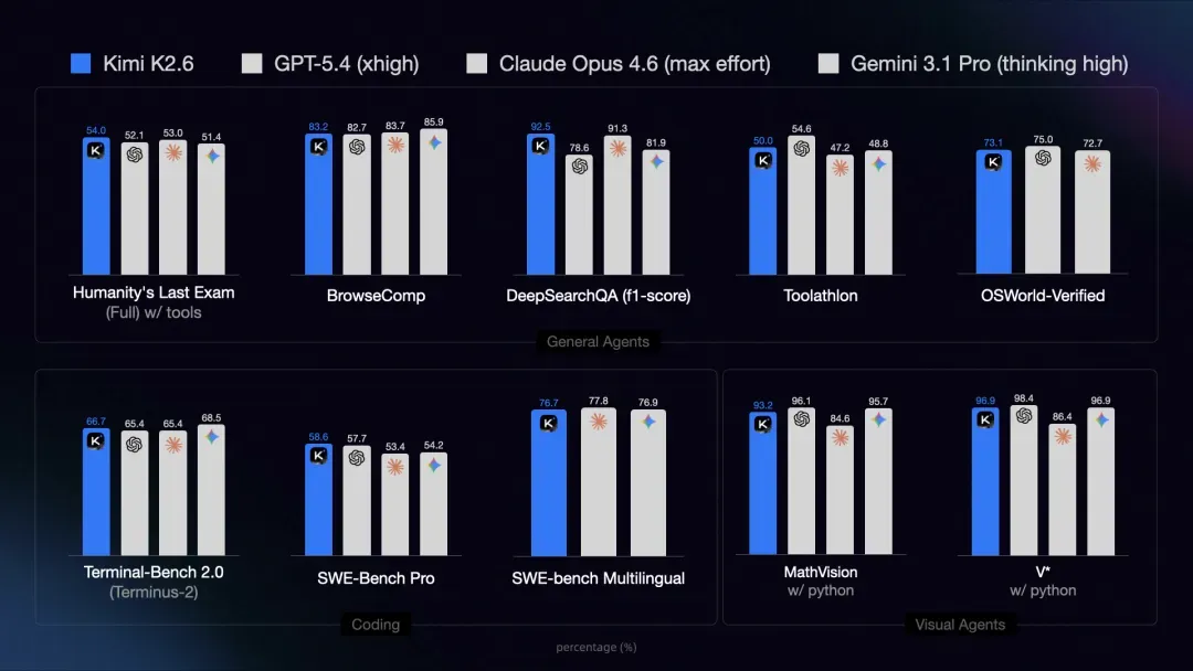 • 月之暗面开启了名为 "Claw 群组" 的小范围内测。允许多个不同技能的AI代理与人类协作,K2.6 充当协调者,当某个代理失败时进行干预。