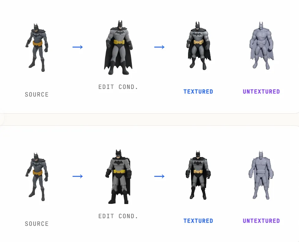 • 几何与结构一致性:该框架在修改模型的同时,能够严格保持原始资产的结构一致性,避免了传统方法中常见的视觉漂移或几何畸变。