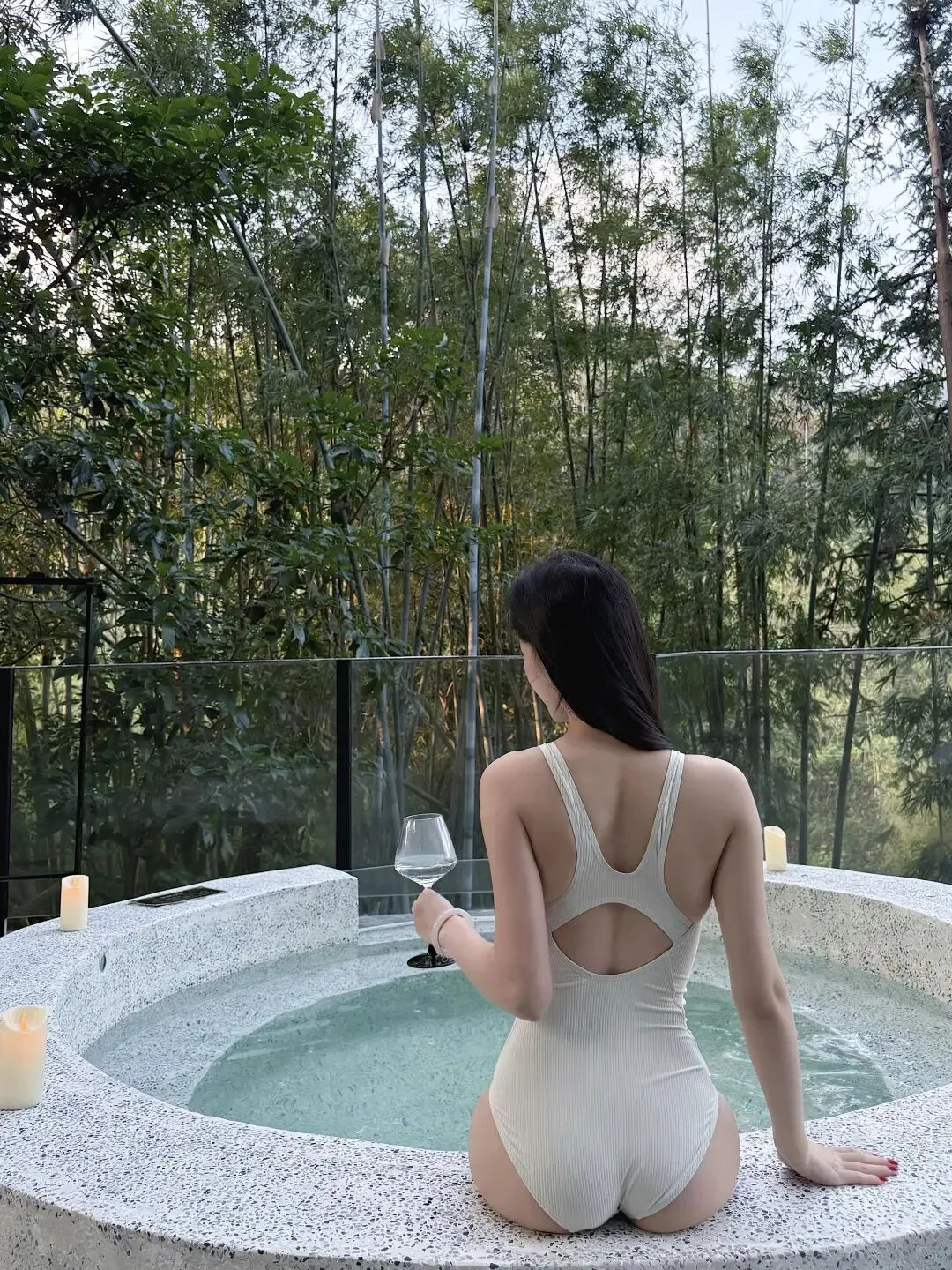 她坐在温泉池边,白色连体泳衣裹着月光,你连呼吸都放轻了