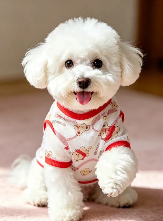 带货视频专用 Prompt 模板:生成一个逼真的宠物服饰带货视频,时长约 10 秒。 场景要求: 1. 室内场景:在室内阳台纯白地毯上,比熊穿着该服饰趴着,对着镜头笑,阳光自然光线,温馨居家感 2. 室外场景:在室外草地上,比熊穿着该服饰自由自在地奔跑玩耍,展示衣服的透气性和舒适度 **光影要求**:模拟夏季上午 11 点的阳光强度和照射角度,光线明亮透彻,体现夏季清凉感 **镜头要求**:多角度拍摄(特写衣服细节+全景展示动态),无背景音乐,无字幕,无旁白,纯自然声