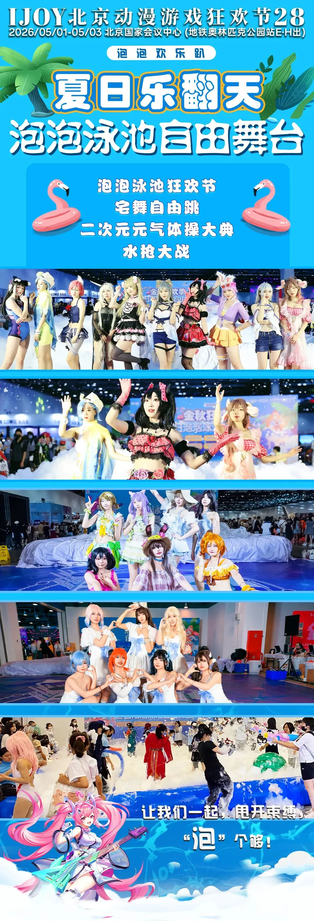 假期限定泳池泡泡趴准备开始!玩泡泡、宅舞自由跳、二次元广场大典、二次元元气体操大典、泳池泳装coser宅舞快闪,最重要在自由舞台会有靓丽的泳装coser们噢!