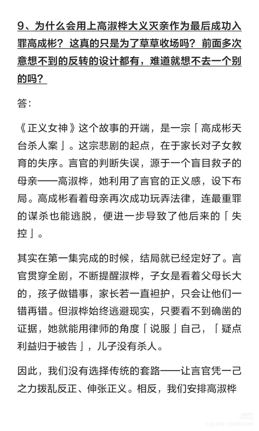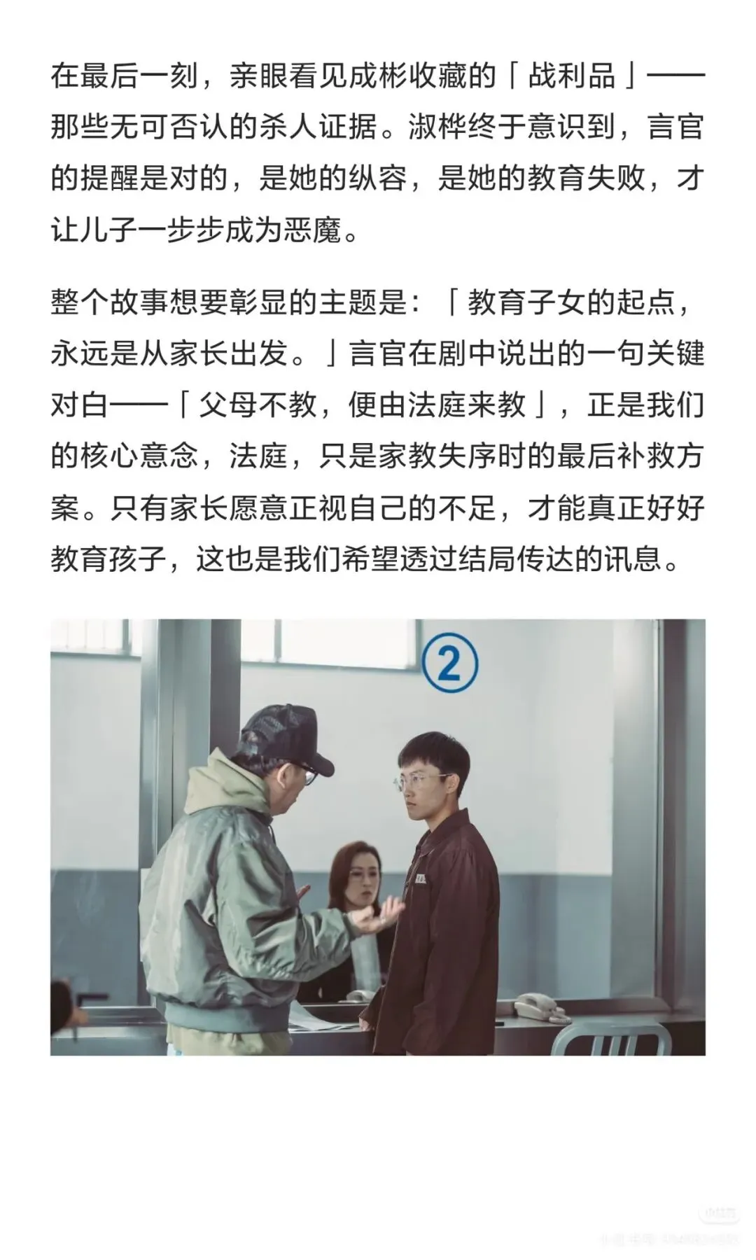 被抓后他让母亲去销毁不利证据,结果母亲将这些证据呈堂,坐实了他的罪名。一开始我认为这种结局有点弱,正义方赢得不够有力,直到看到导演对这个问题的解答,“整个故事想要彰显的主题是:教育子女的起点,永远是从家长出发。”我总算可以试着接受结局了。对高成彬来说,来自母亲的正义审判或许才是对他最大的惩罚,这份迟到了许多年的心理教育终于以终身监禁的方式补上了。