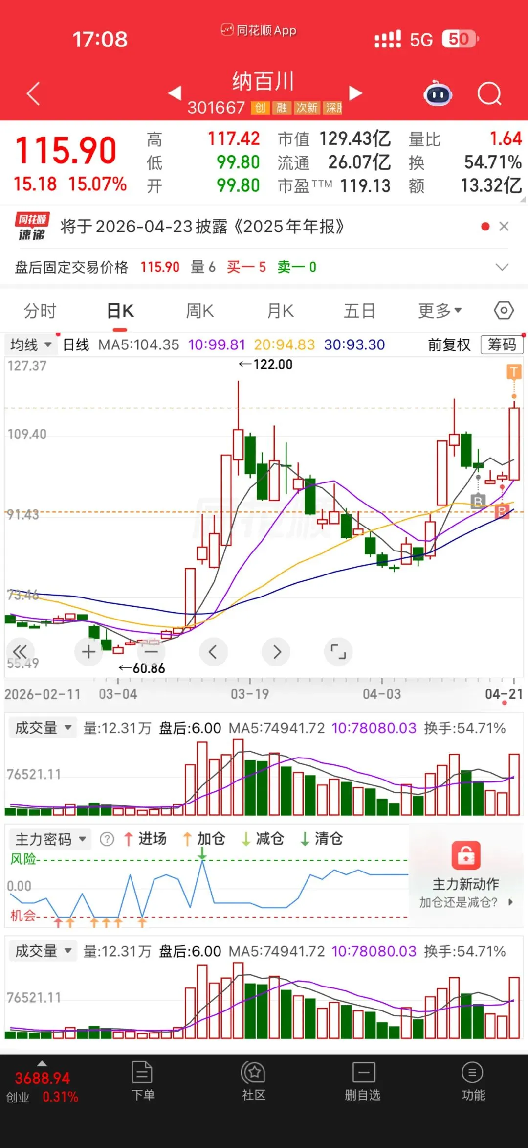 这只票,我建仓的第一天我就发出来了,今天直接给我来了个15%的大阳线,差点摸到涨停!从99.80一路拉到117.42,直接突破前高,站上115!