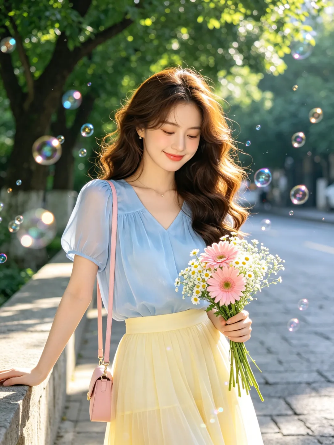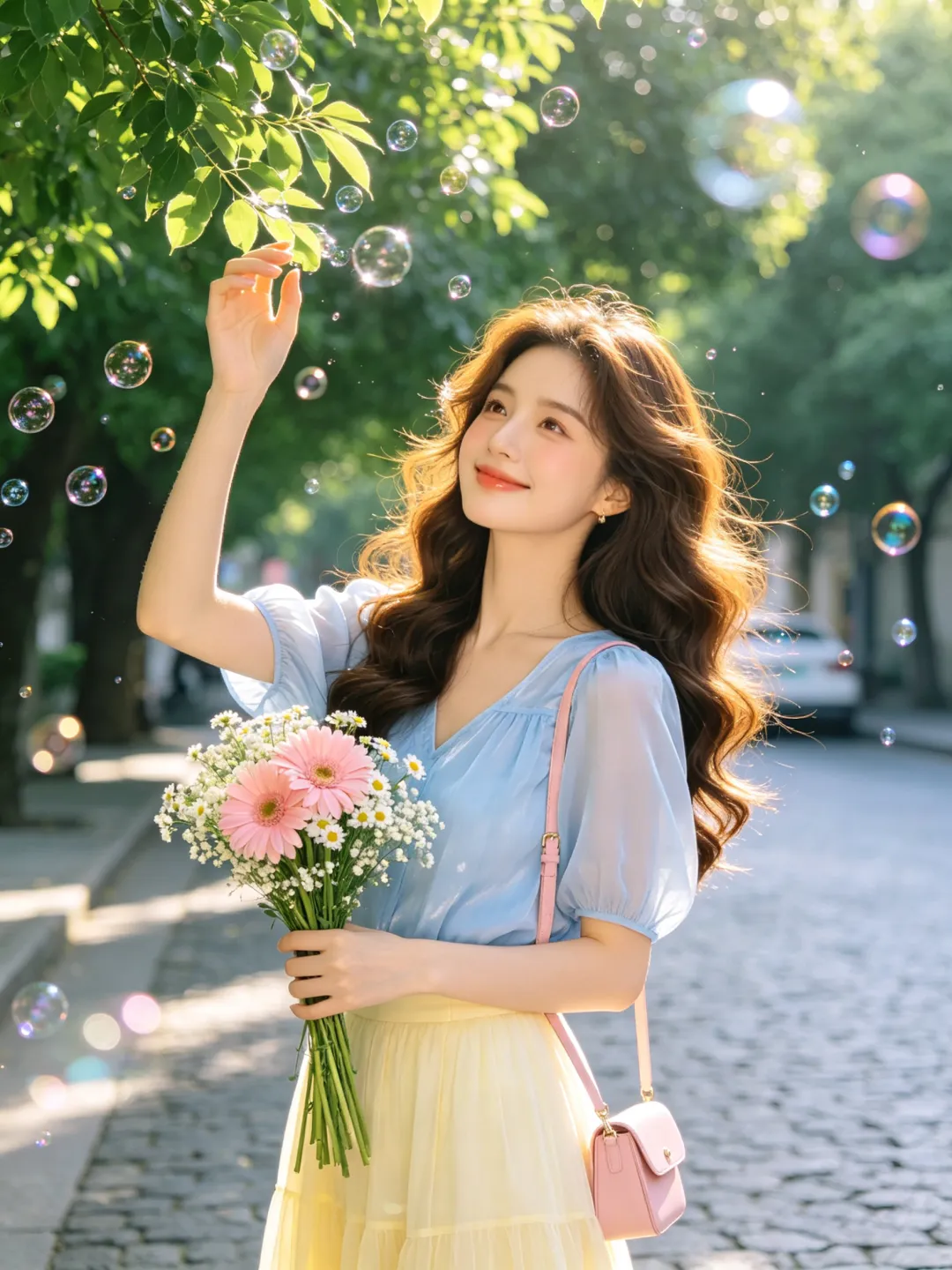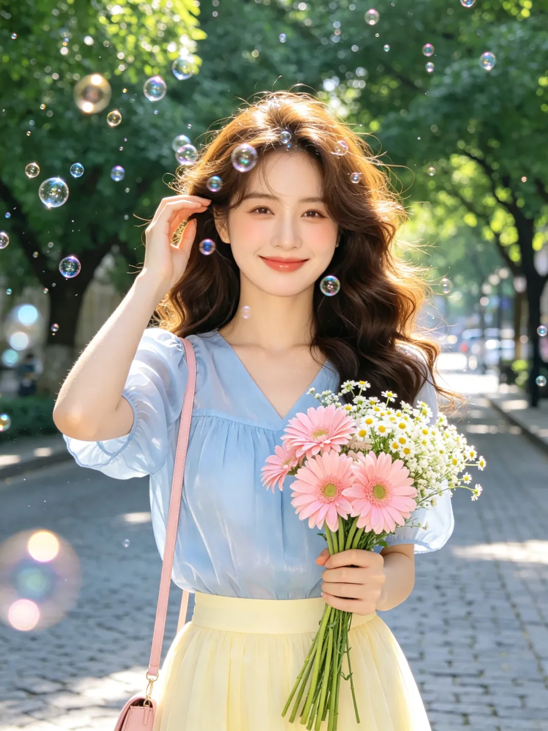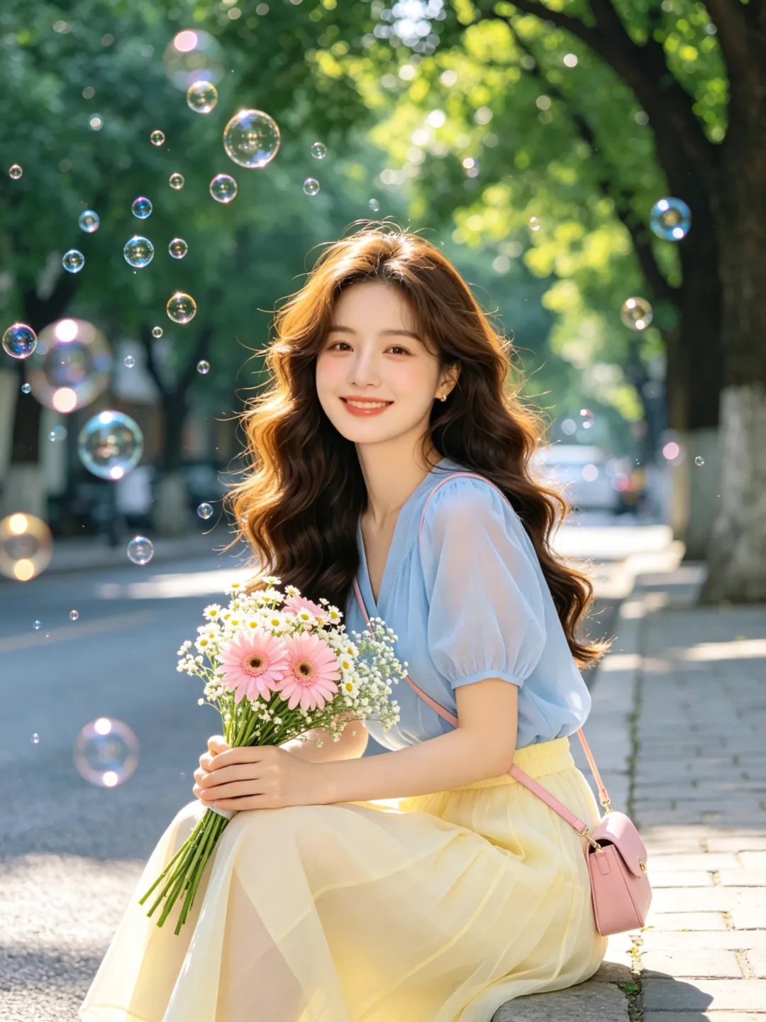 提示词:生成8张图片,夏日午后林荫街道,干净凉爽城市小路,青石板路面,茂密浓绿夏日大树树荫,明媚阳光穿过树叶洒落细碎光斑,清新夏日空气感;20-25 岁东亚年轻女生,奶油清透水光肌肤,蓬松棕色大波浪长卷发,清甜温柔笑容,清澈明亮眼眸;上身浅蓝冰丝透气 V 领短袖雪纺上衣,轻薄飘逸面料,下身淡黄色高腰轻盈雪纺半身长裙,粉色细肩带腋下小包;多种优美姿态,静谧坐姿手捧花束微侧身坐于路边石阶,微微俯身轻嗅花香,后背慵懒靠坐树干眺望远方,抬手轻拨耳边卷发承接光影,屈膝抱膝花束轻贴脸颊,侧身站立石板路回眸浅笑,手扶石阶低头温柔浅笑,抬手指尖轻接阳光触碰空中泡泡;金色柔和夏日侧逆光,通透发丝轮廓光,前景梦幻散景光斑,空中漂浮清凉透明泡泡;清透夏日裸妆,淡粉腮红,珊瑚水光唇彩,温柔棕色眼影,细腻水光透气肌肤;花束为粉色非洲菊、白色小雏菊、满天星,花茎自然垂落;整体梦幻柔焦,清爽暖夏色调,泡泡光晕,电影氛围感,浪漫清新治愈,粉蓝低饱和柔和配色,高清写实照片质感,细腻皮肤纹理,景深虚化,构图舒适,面部精致完整。