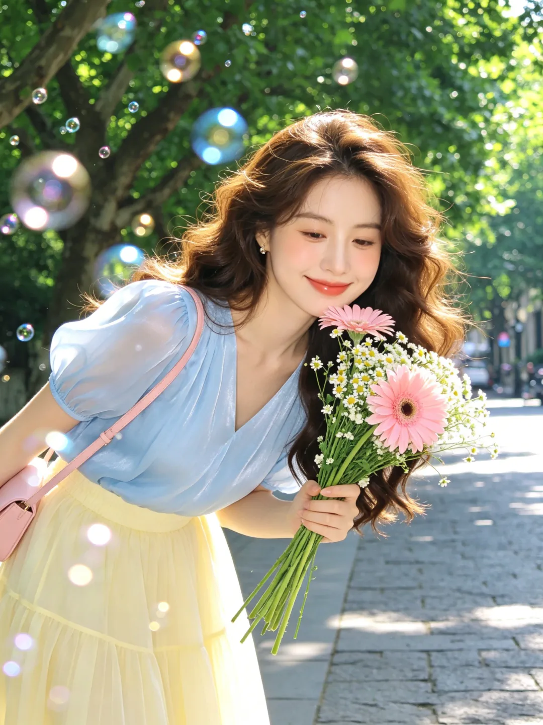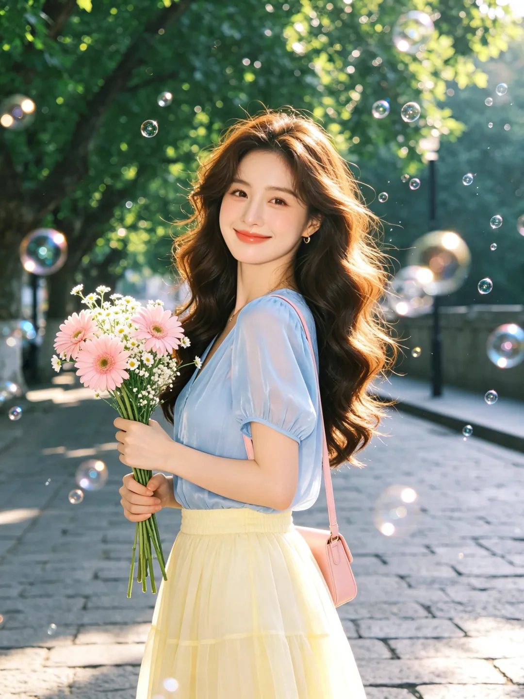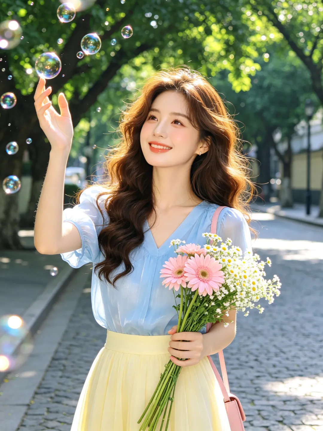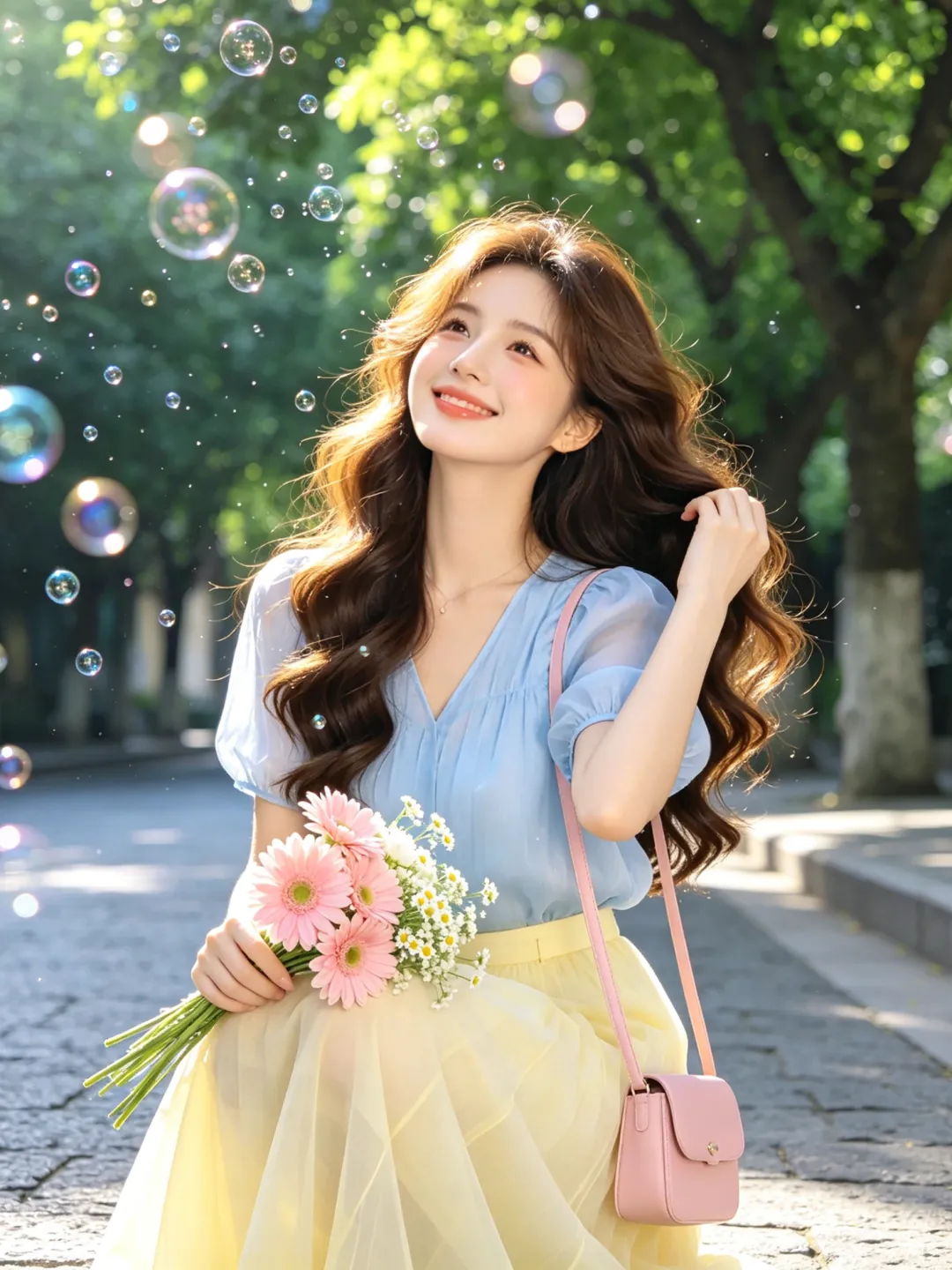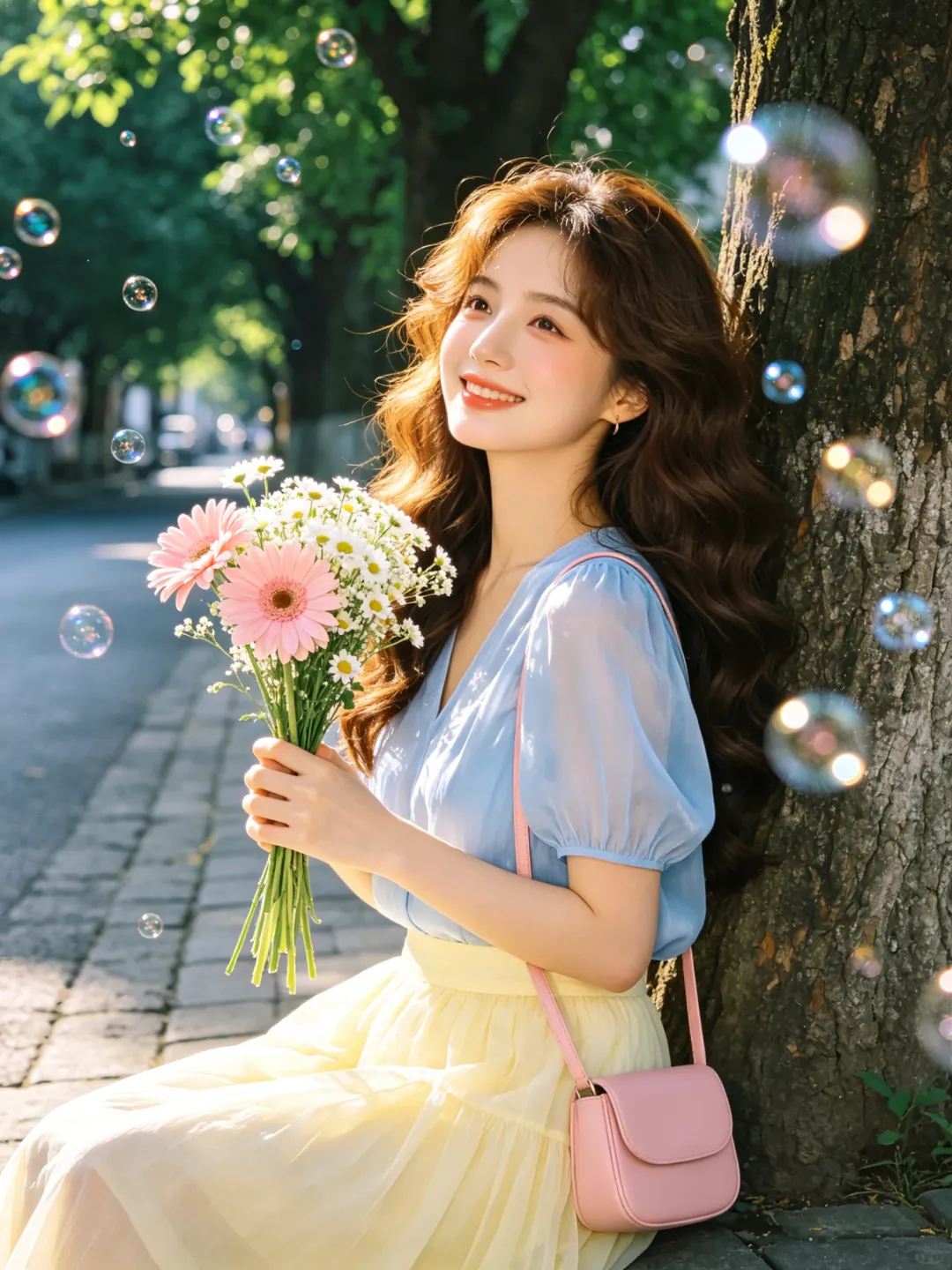 提示词:生成8张图片,夏日午后林荫街道,干净凉爽城市小路,青石板路面,茂密浓绿夏日大树树荫,明媚阳光穿过树叶洒落细碎光斑,清新夏日空气感;20-25 岁东亚年轻女生,奶油清透水光肌肤,蓬松棕色大波浪长卷发,清甜温柔笑容,清澈明亮眼眸;上身浅蓝冰丝透气 V 领短袖雪纺上衣,轻薄飘逸面料,下身淡黄色高腰轻盈雪纺半身长裙,粉色细肩带腋下小包;多种优美姿态,静谧坐姿手捧花束微侧身坐于路边石阶,微微俯身轻嗅花香,后背慵懒靠坐树干眺望远方,抬手轻拨耳边卷发承接光影,屈膝抱膝花束轻贴脸颊,侧身站立石板路回眸浅笑,手扶石阶低头温柔浅笑,抬手指尖轻接阳光触碰空中泡泡;金色柔和夏日侧逆光,通透发丝轮廓光,前景梦幻散景光斑,空中漂浮清凉透明泡泡;清透夏日裸妆,淡粉腮红,珊瑚水光唇彩,温柔棕色眼影,细腻水光透气肌肤;花束为粉色非洲菊、白色小雏菊、满天星,花茎自然垂落;整体梦幻柔焦,清爽暖夏色调,泡泡光晕,电影氛围感,浪漫清新治愈,粉蓝低饱和柔和配色,高清写实照片质感,细腻皮肤纹理,景深虚化,构图舒适,面部精致完整。