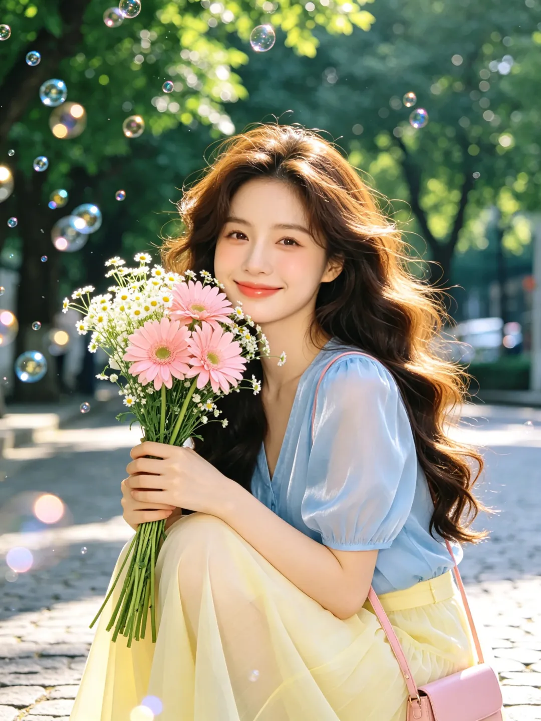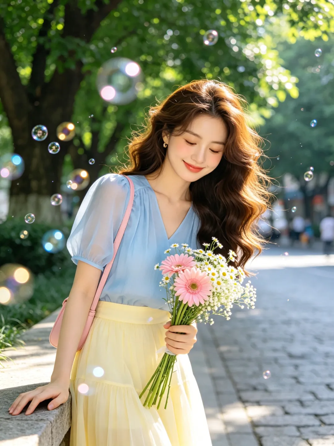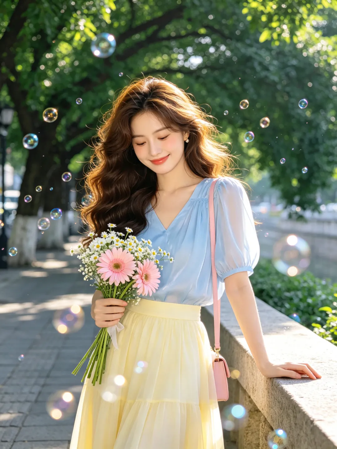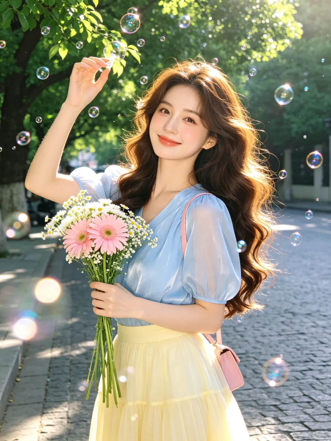 提示词:生成8张图片,夏日午后林荫街道,干净凉爽城市小路,青石板路面,茂密浓绿夏日大树树荫,明媚阳光穿过树叶洒落细碎光斑,清新夏日空气感;20-25 岁东亚年轻女生,奶油清透水光肌肤,蓬松棕色大波浪长卷发,清甜温柔笑容,清澈明亮眼眸;上身浅蓝冰丝透气 V 领短袖雪纺上衣,轻薄飘逸面料,下身淡黄色高腰轻盈雪纺半身长裙,粉色细肩带腋下小包;多种优美姿态,静谧坐姿手捧花束微侧身坐于路边石阶,微微俯身轻嗅花香,后背慵懒靠坐树干眺望远方,抬手轻拨耳边卷发承接光影,屈膝抱膝花束轻贴脸颊,侧身站立石板路回眸浅笑,手扶石阶低头温柔浅笑,抬手指尖轻接阳光触碰空中泡泡;金色柔和夏日侧逆光,通透发丝轮廓光,前景梦幻散景光斑,空中漂浮清凉透明泡泡;清透夏日裸妆,淡粉腮红,珊瑚水光唇彩,温柔棕色眼影,细腻水光透气肌肤;花束为粉色非洲菊、白色小雏菊、满天星,花茎自然垂落;整体梦幻柔焦,清爽暖夏色调,泡泡光晕,电影氛围感,浪漫清新治愈,粉蓝低饱和柔和配色,高清写实照片质感,细腻皮肤纹理,景深虚化,构图舒适,面部精致完整。