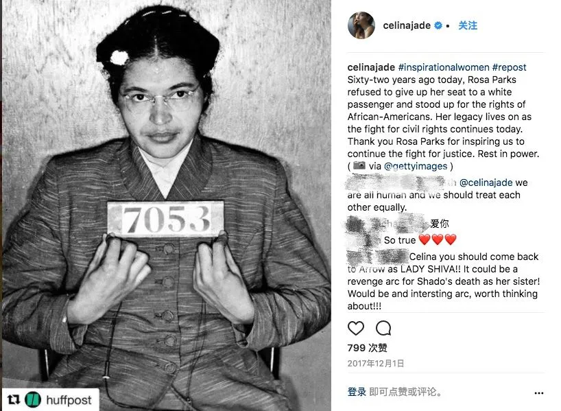 她祭奠黑人民权领袖Rose Parks,为少数族裔的权益和社会正义打call助力。