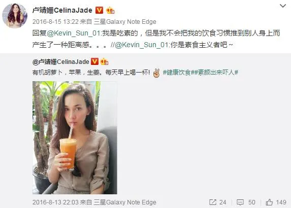 关注卢靖姗的粉丝都知道她是位素食者,她经常会在微博上分享一些素美食和食谱、做菜视频,仔细的解释素食对健康的好处,对环境保护的帮助,而不是把自己的饮食方式强行加到别人身上,合理地建议、鼓励大家多多素食。