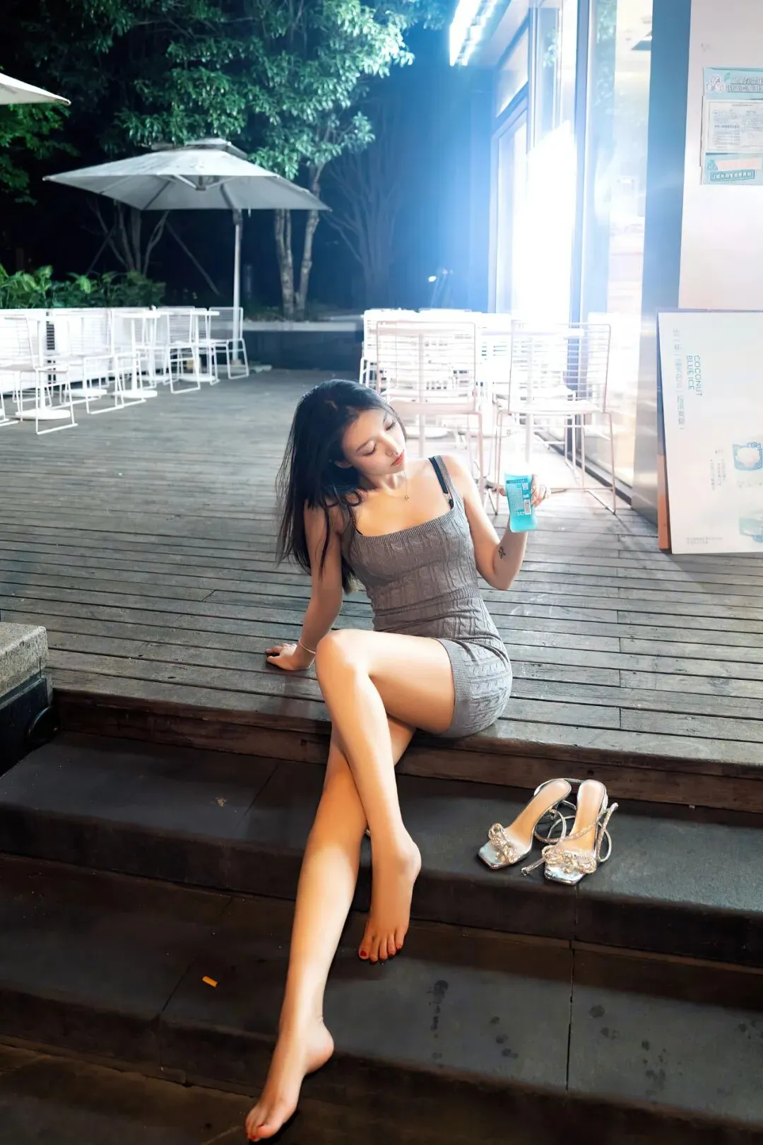 一件咖色无袖连衣裙,搭配黑丝和黑色高跟鞋,特意露出内衣的肩带,给人无限遐想空间,非常性感。