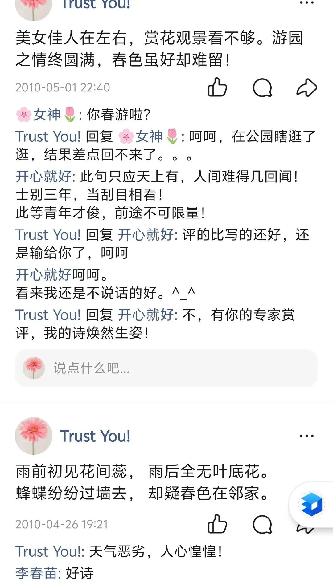 她喜欢写诗,笔下文字如大地般淳朴厚重。我很少写诗,偶尔创作一下,风格也不自觉飘向云端:“冰心玉魂影独孤,广寒宫外桂香浮。举杯邀月醉漫步,寒夜凉风冷蝶舞。”“荷倚清波香自在,风含幽韵悄然开。心随淡月烟霞远,半在人间半蓬莱。”我们在文字表达上的反差感,让我俩都觉得格外有趣。