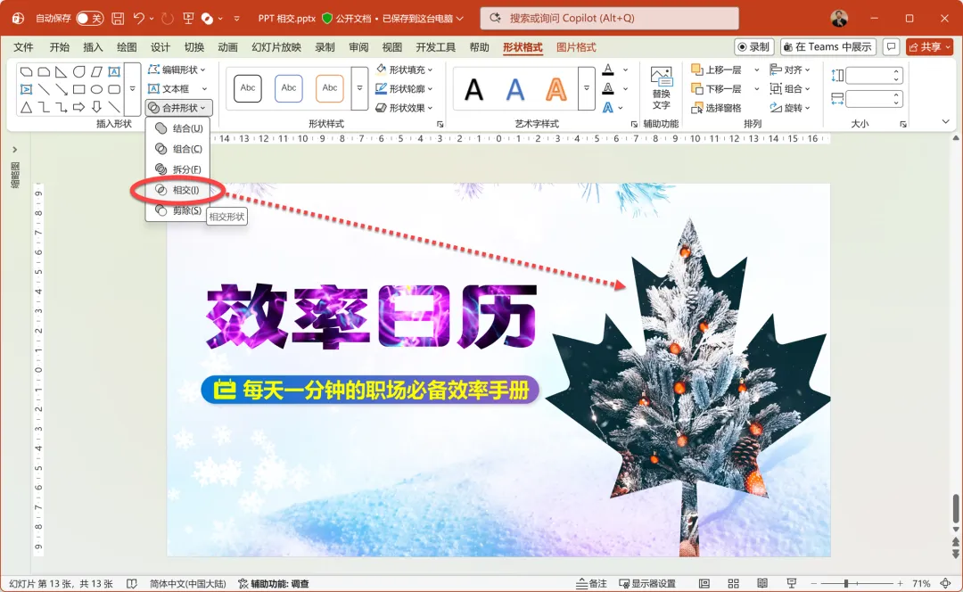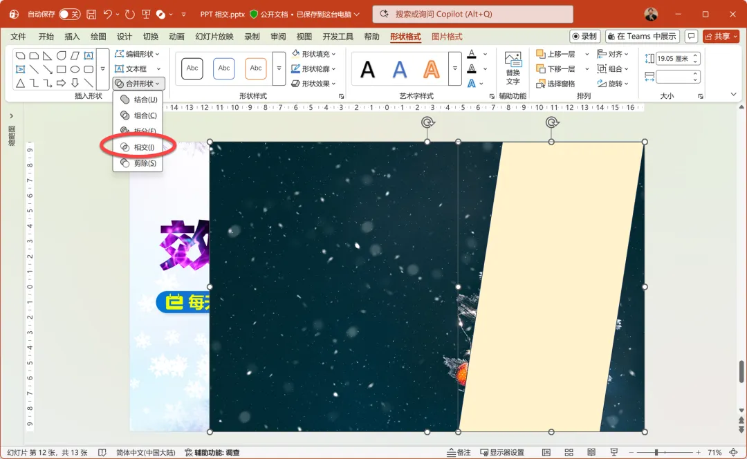 你看,在 PowerPoint 幻灯片中添加一个特定形状,然后先选中待处理的图片,再选中形状,打开“形状格式”选项卡中的合并形状命令下拉列表,并执行相交命令。