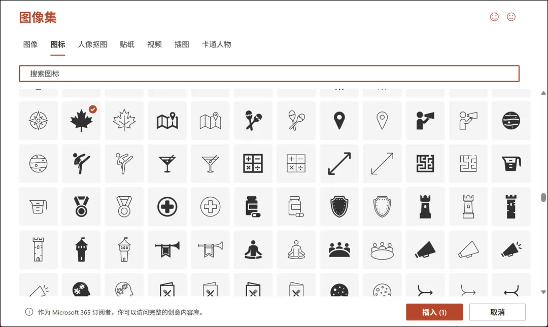 当然,这样的操作不仅限于 PowerPoint 内置的形状,你也可以打开“插入”选项卡,从图标集中找到适合的图标。