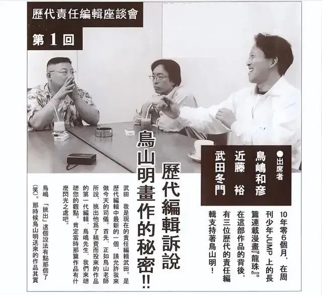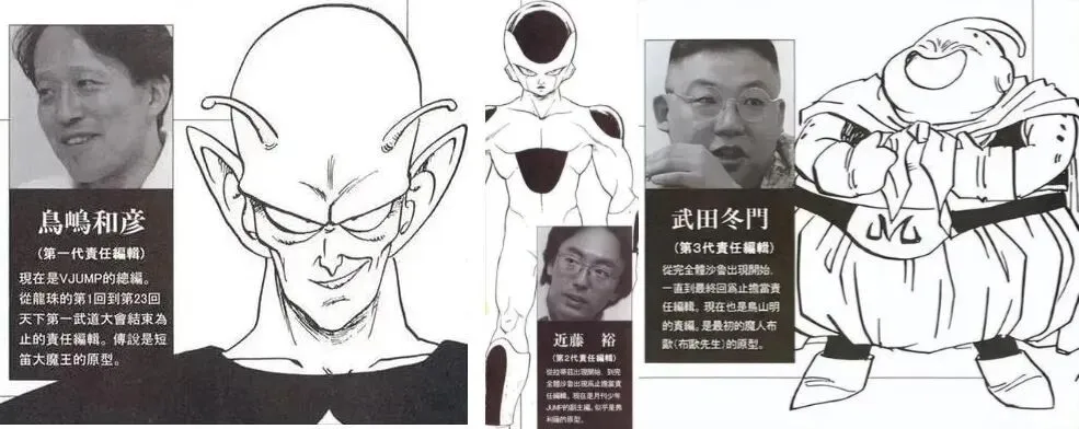 下面三任编辑分别是短笛大魔王、弗利萨、布欧的原型。大家比较熟悉的是第一任编辑鸟岛和彦,他是鸟山明的伯乐,在悟空击败比克大魔王后,反对完结剧情,提出“让悟空成为宇宙第一”的大方向,促使故事进入赛亚人篇,随后他高升集英社高层。第二任编辑近藤裕,他从‌赛亚人篇(拉蒂兹登场)开始‌,一直负责到‌沙鲁完全体出现。