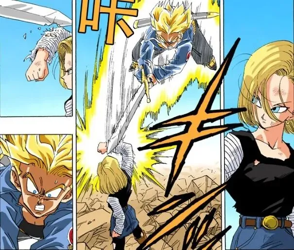 龙珠漫画之前并未出现战力很强的女性角色,布尔玛、琪琪、兰琪和悟空等Z战士们压根不在一个层面,而18号一出场就可以吊打超赛贝吉塔。被踢断手臂,跪地惨败,赛亚人王子的高傲碎了一地。而超赛特兰克斯护爹心切,不讲武德偷袭,更是直接被18号单臂震碎高科技合金剑,要知道特兰克斯可是一出场就拿这把剑切碎了机械改造过的弗利萨大王。我怀疑贝吉塔后来放任沙鲁吞掉18号,就是小心眼记仇。