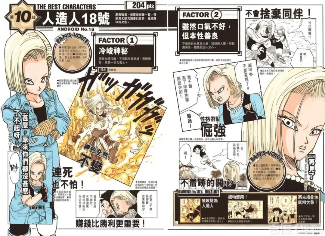 2004年漫画设定集人气榜:18号名列第十。2025年《龙珠》40周年全球人气榜:18号力压沙鲁、弗利萨两位大佬,名列第八,遥遥领先龙珠中的其他女性角色。