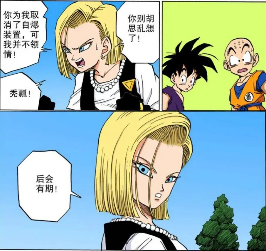 面对克林向神龙许愿去掉17号和18号的自爆装置,并觉得17号18号更般配。18号跳出来说明两人是孪生姐弟,并骂了克林一通,最后留下一句:后会有期。喏~这个就叫做“傲娇”咯~