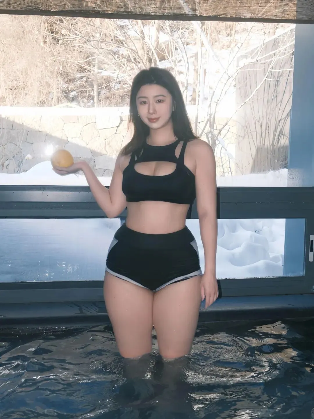 她跪在温泉池边,黑色泳衣裹着雪景,你把手机滑到屏幕裂了都没舍得关
