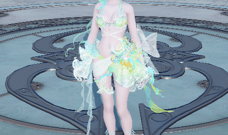 成女款式勾勒出柔美的线条,青柠绿渐变贝壳胸衣搭配同色系绑带,大胆露出锁骨与肩颈线条,半透明的纱质飘带轻盈灵动,搭配同色系绑带凉鞋,将海洋的浪漫与夏日的清爽完美融合。
