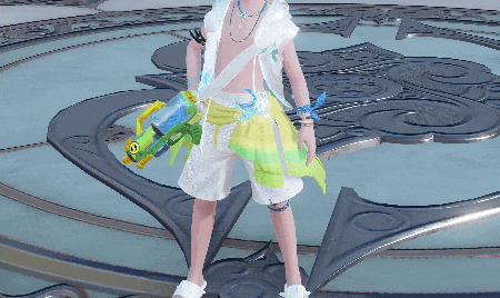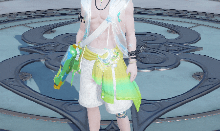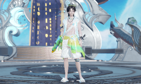 成男款式走阳光沙滩风,腰间黄绿渐变装饰搭配贝壳,无袖设计秀出肌肉线条,白色短裤简约利落。再加上护目镜、项链、腕带,海岛运动少年的既视感直接拉满!