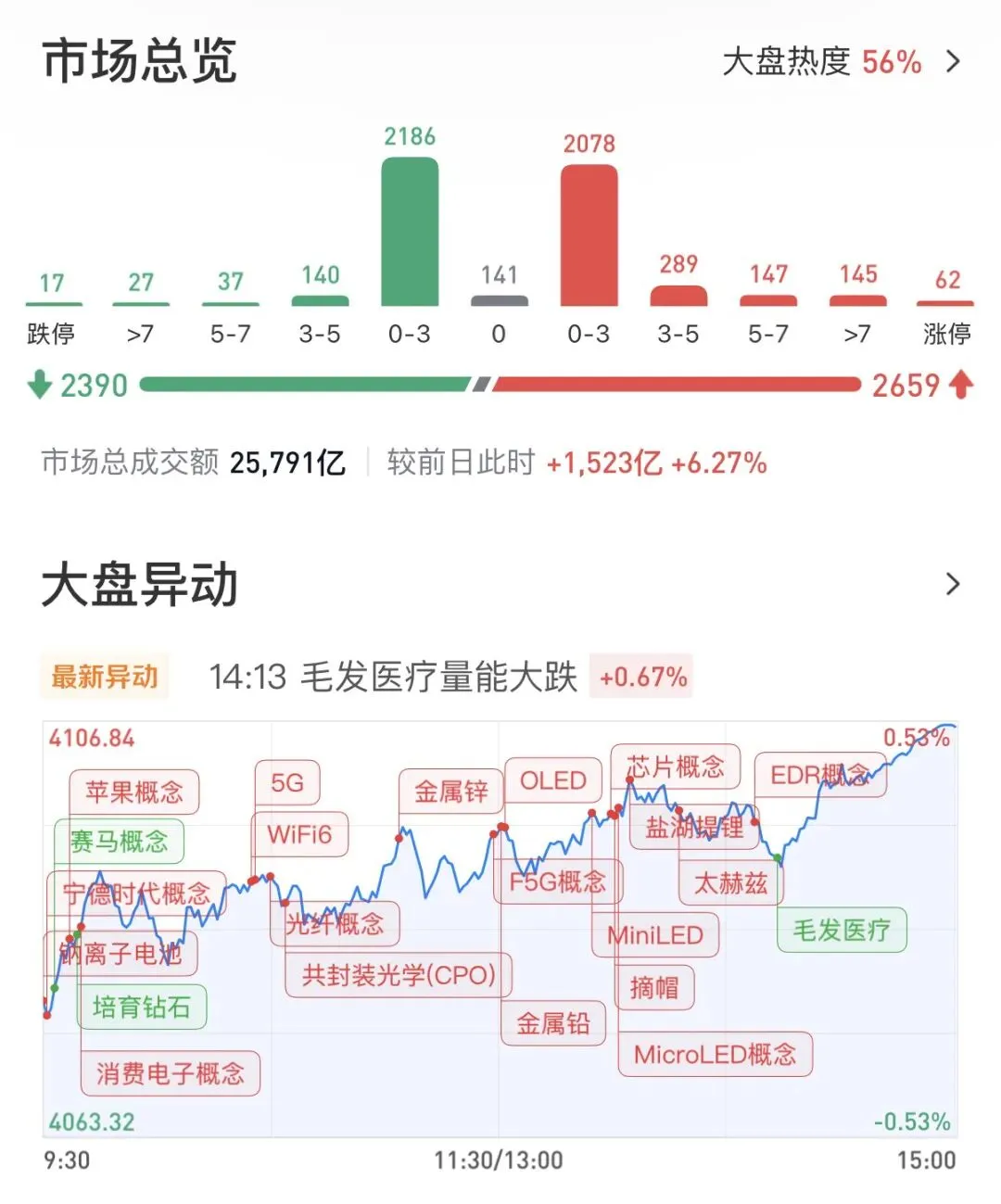 沪深两市成交额放量到2.56万亿元,全市场超过2900只个股上涨,算力硬件方向全线拉升,CPO概念再度爆发,东山精密、长光华芯直接涨停创历史新高,工业富联也摸了一把涨停。