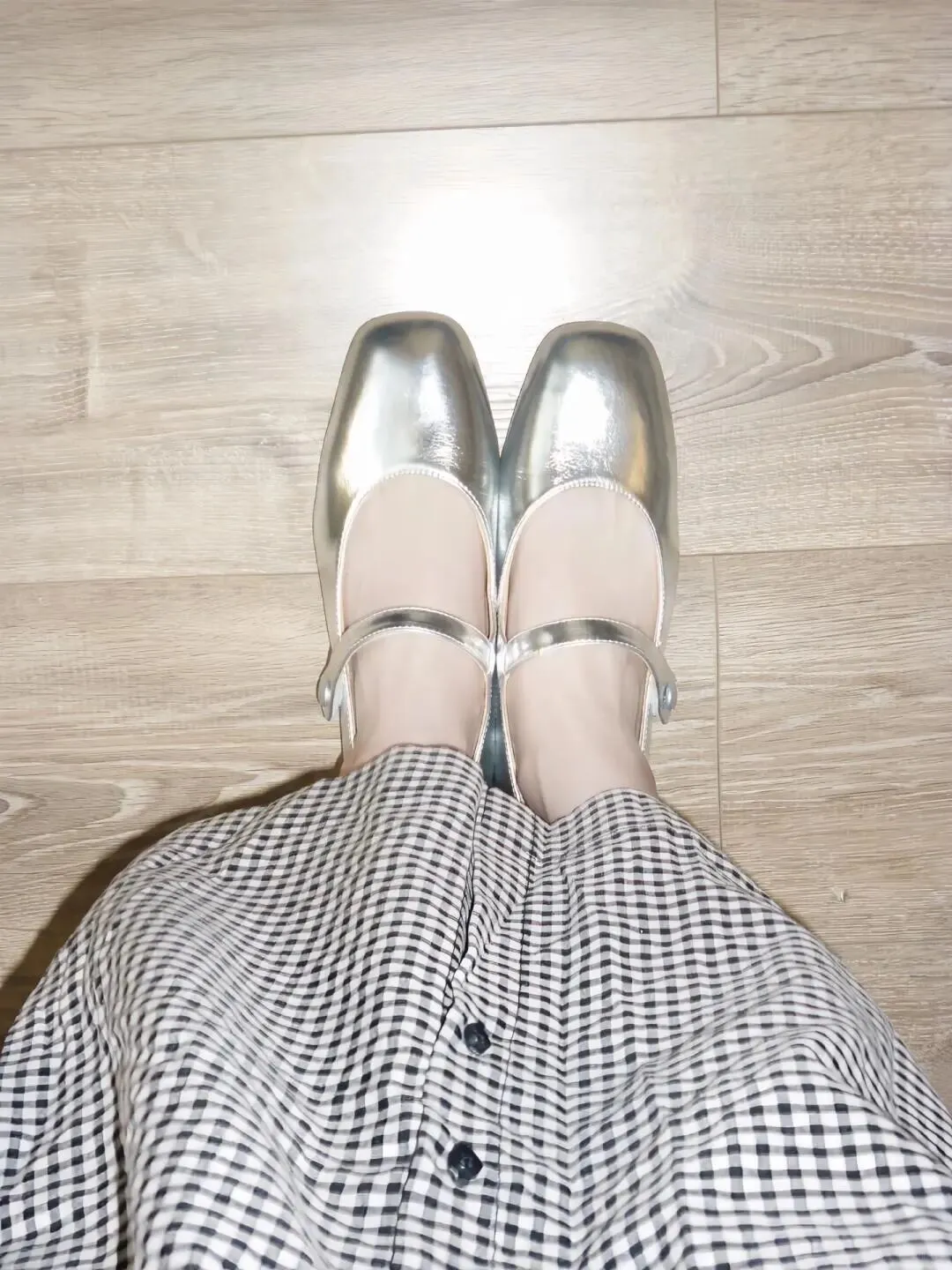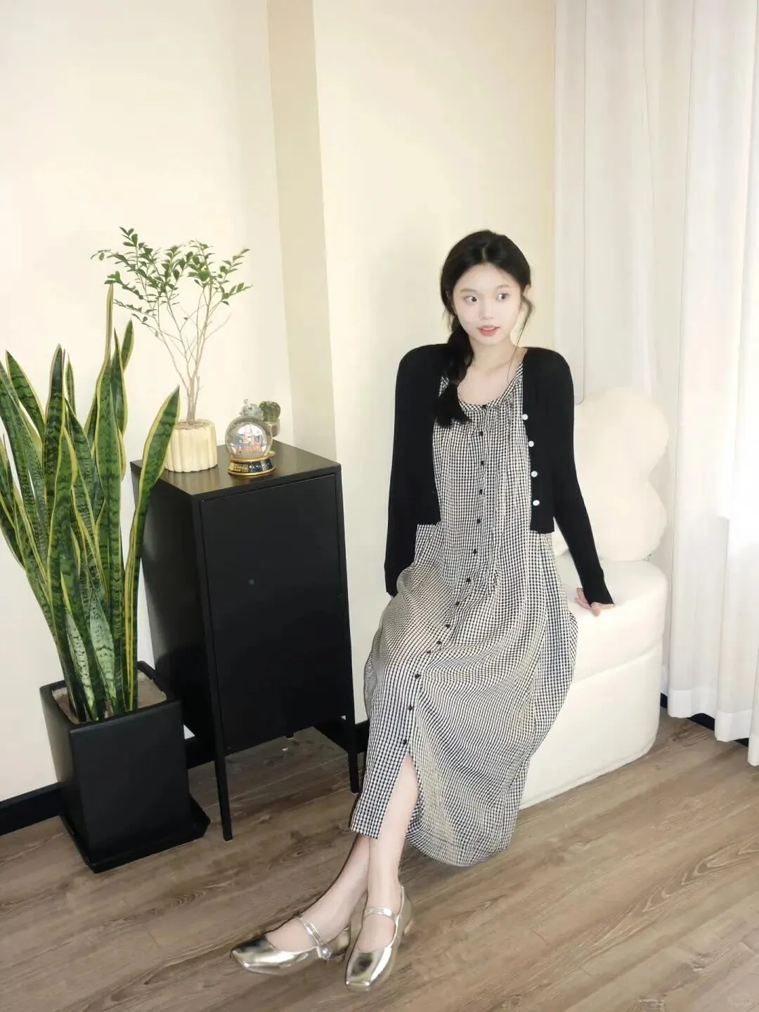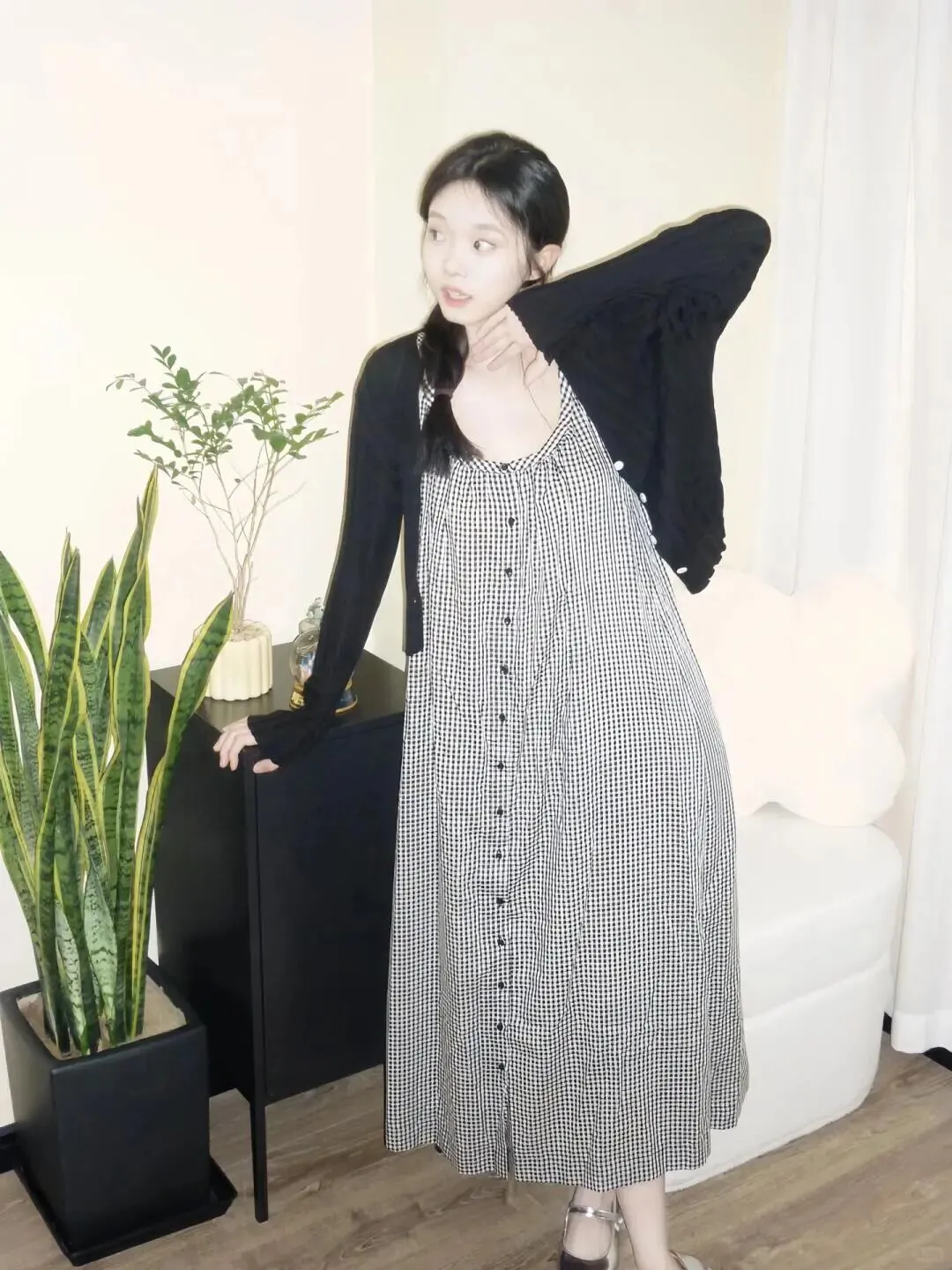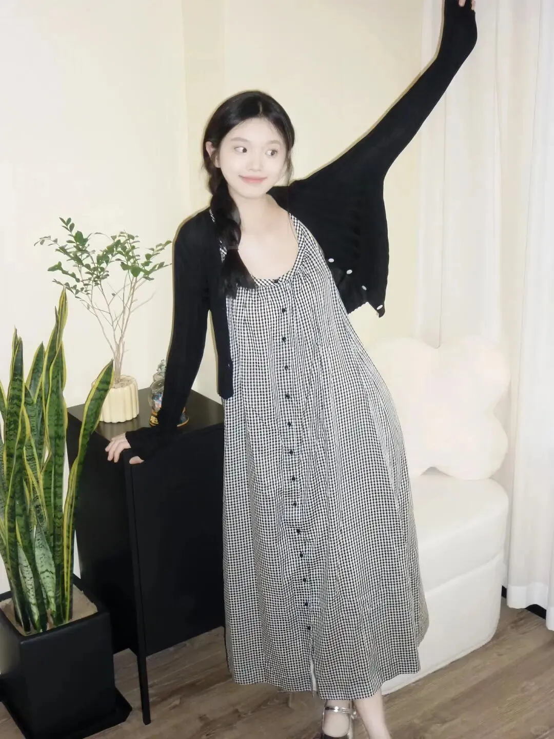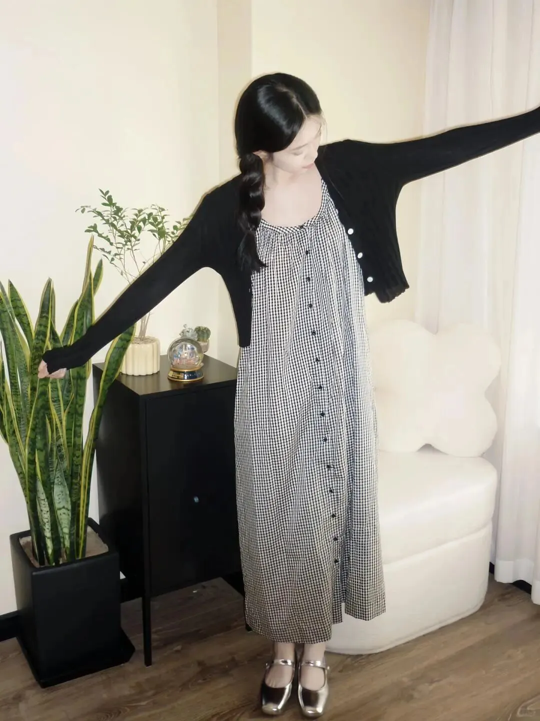 居家拍照,背景通常比较杂乱,所以穿搭上一定要干净。像图里这种黑白细格纹的吊带长裙,就是永远不会出错的经典单品。它自带一种复古的滤镜感,而且竖条纹的视觉延伸效果特别好。外面随便搭一件黑色的短款针织开衫,既能遮住手臂上的拜拜肉,又能提高腰线。记住,衣服颜色不要超过三种,黑白灰永远是最显高级的配色。鞋子选了一双银色的玛丽珍鞋,增加了一点亮点,让整体造型不会太沉闷。头发编成侧边的麻花辫,瞬间减龄五岁,温柔感扑面而来。