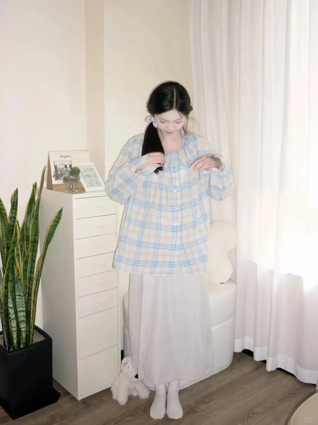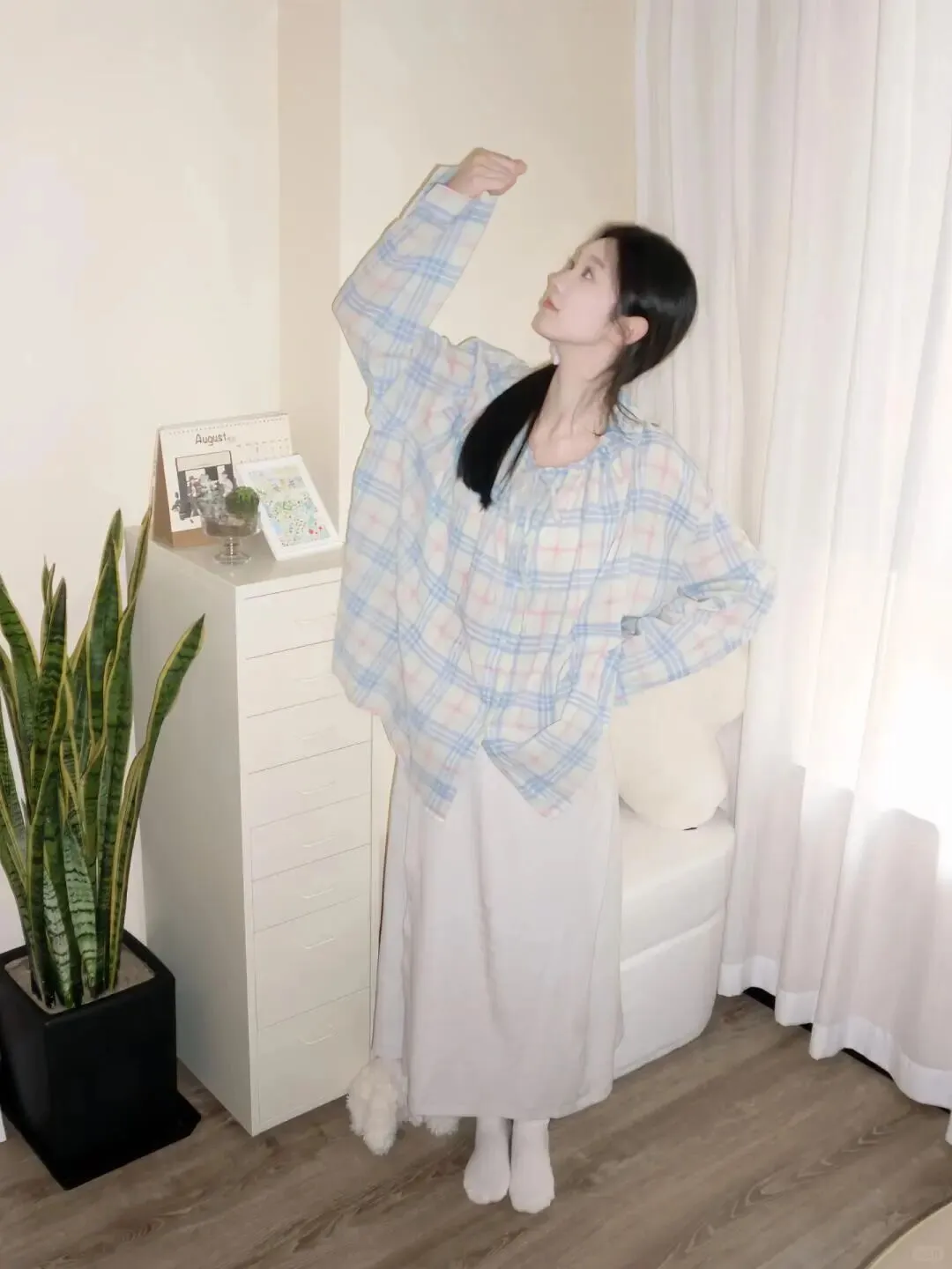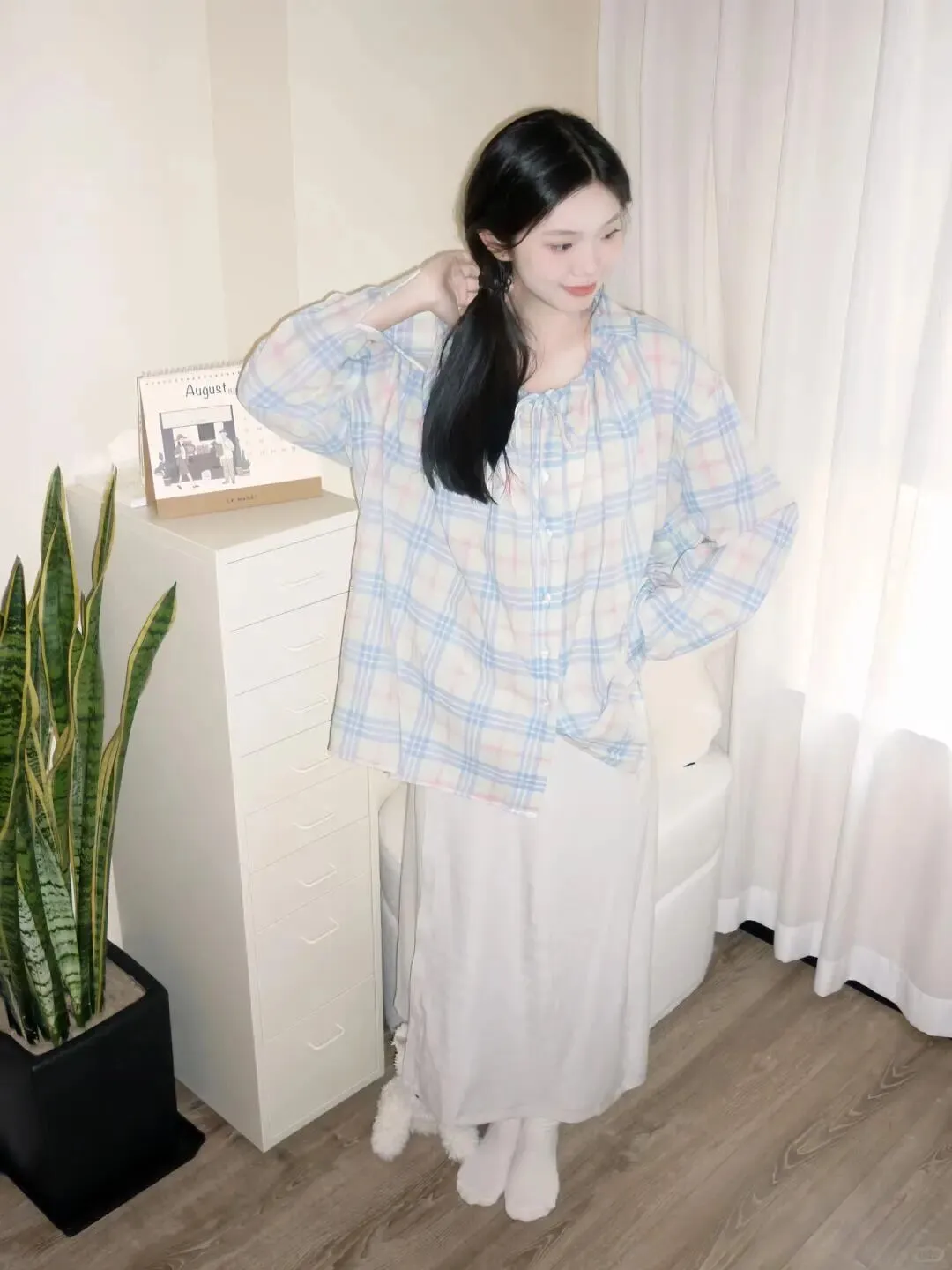 居家写真讲究的是松弛感,所以衣服不要穿得太正式或者颜色太杂乱。像图片里这种浅蓝色粉色相间的格子衬衫,就非常有春天的气息,搭配一条纯白色的棉质长裙,整体色调清新明亮。白色下装不仅能反光补光,还能让下半身看起来更轻盈。袜子也建议选白色,和裙子呼应,视觉上延长腿部线条。 浅蓝粉红最减龄,白色下装显干净 ,这种低饱和度的配色方案,怎么拍都不会出错,给人一种邻家女孩的亲切感。