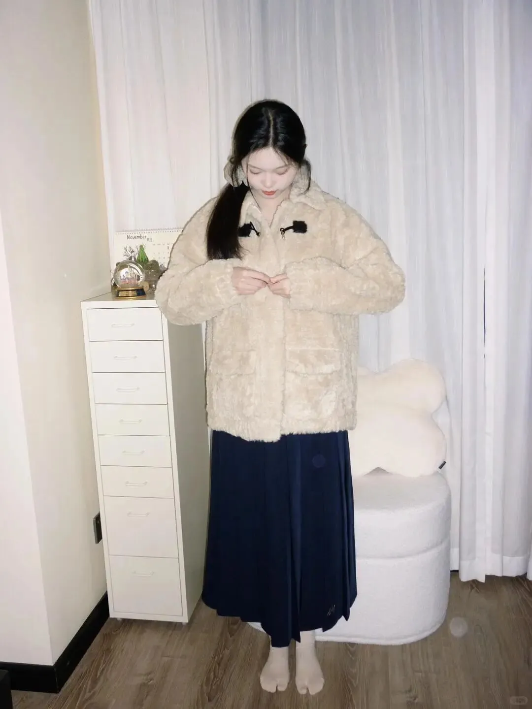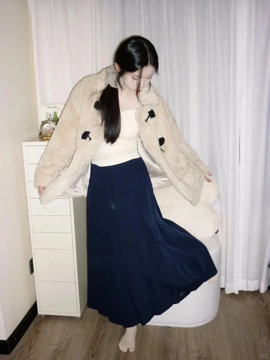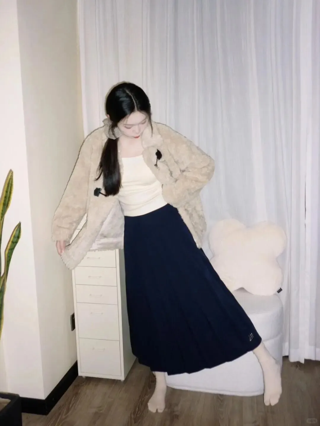 首先说说穿搭,这是决定照片风格的关键。春天虽然回暖,但早晚仍有凉意,像图中这样选择一件米色毛绒外套搭配黑色长裙,既保暖又有质感。毛绒材质自带温柔滤镜,黑色长裙则能压住整体色调,显得沉稳大气。注意内搭尽量选择浅色,比如白色打底,这样能提亮肤色,避免显得沉闷。裙子的长度最好过膝,这样在走动或坐下时,裙摆的垂坠感能很好地修饰腿型,营造出优雅修长的视觉效果