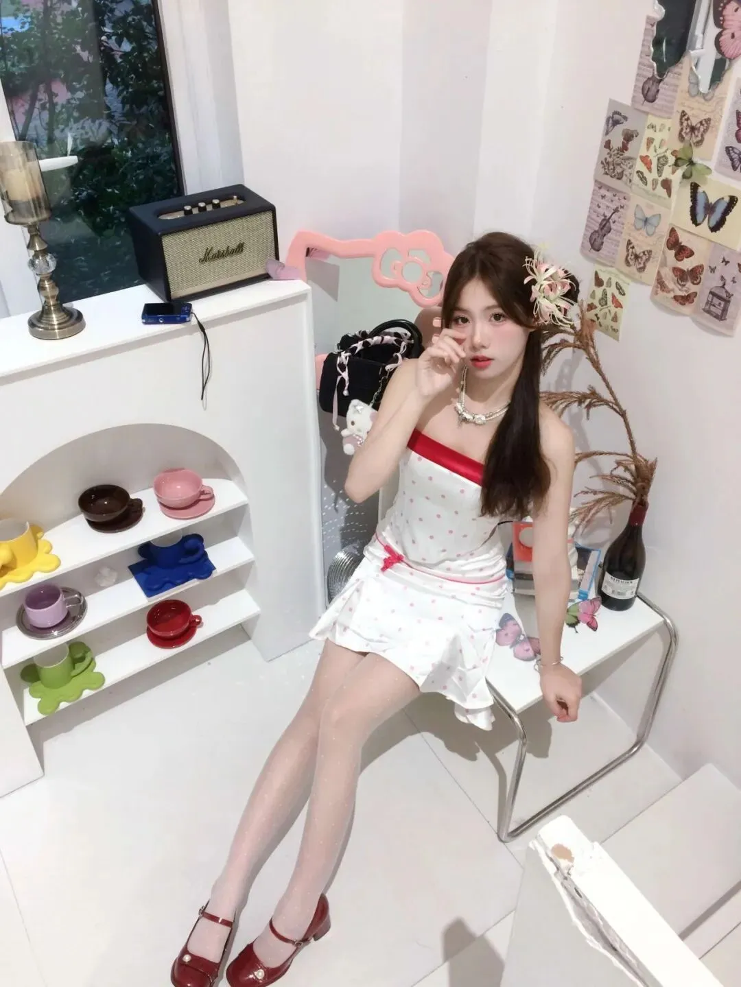 拍照要想出片,穿搭是第一要素。这组照片采用的是经典的红白配色,白色波点吊带裙清爽干净,红色肩带和鞋子作为点缀,瞬间提亮肤色。夏天拍照切忌全身黑或全身灰,容易显得沉闷。选择白色为主色调,能让画面看起来通透呼吸感强,而红色的配饰比如鞋子、发饰或者手中的道具,能形成视觉焦点。丝袜的选择也很重要,带有细闪的白色丝袜在灯光下会有波光粼粼的效果,不仅修饰腿型,还增加了一丝梦幻的少女感。记住,色彩对比度越高,照片越吸睛。