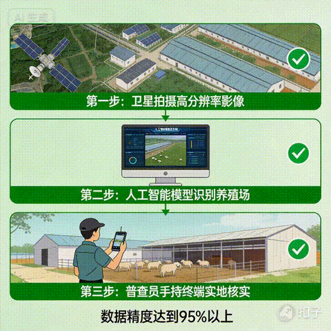 AI自动识别养殖场,普查员上门实地核验,修正误差。