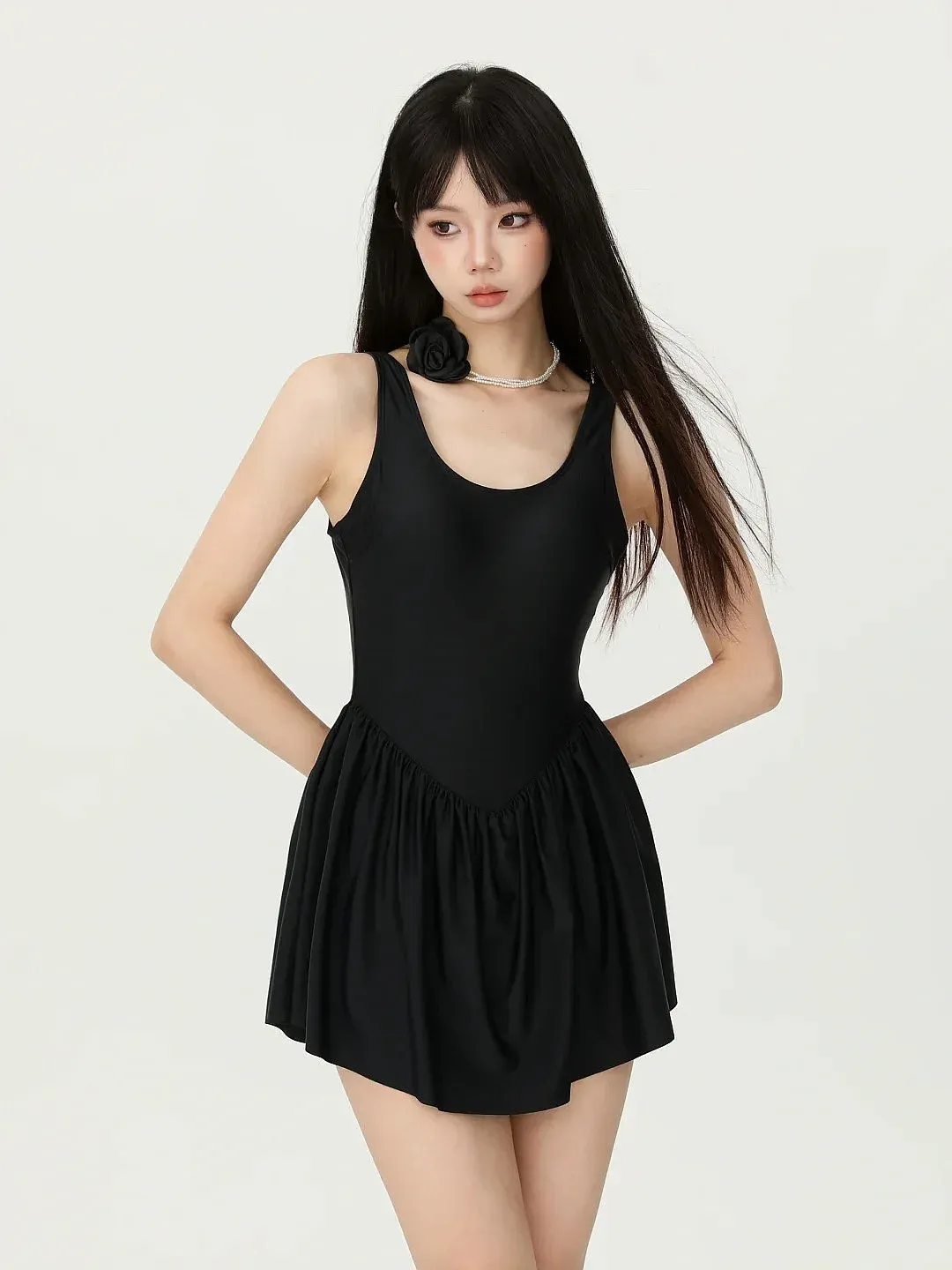 黑色这件让我想起了去年买的显瘦泳裙。试衣间还好,一到温泉区就沾了水,裙子直接贴在腿上,本来想遮的地方反而全都露了出来,只好一路拉着下摆走。后来才明白游泳服的显瘦不是靠遮盖而是要面料能够撑住形状并且线条不能乱来。这张图中的黑色在这里很聪明,在裙摆上有一定的量感但是主体还是干净的。