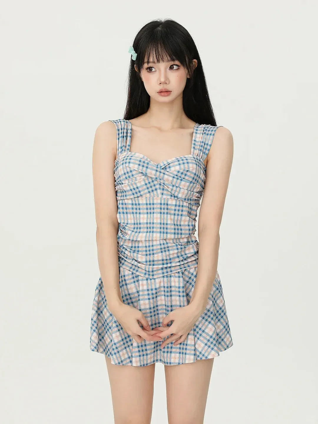 格纹这条路也是另一条路子。第一眼看去是甜的,第二眼看到它没有那种腻味的感觉,在胸前交叉、腰侧褶皱的基础上再加一点蓝色,就像把少女感降低了一个档次,所以就不装了。小发夹轻得刚刚好,反而是配饰减少到一个发卡的时候朋友的第一句话不是“你好可爱”,而是“你今天气色很好”。
