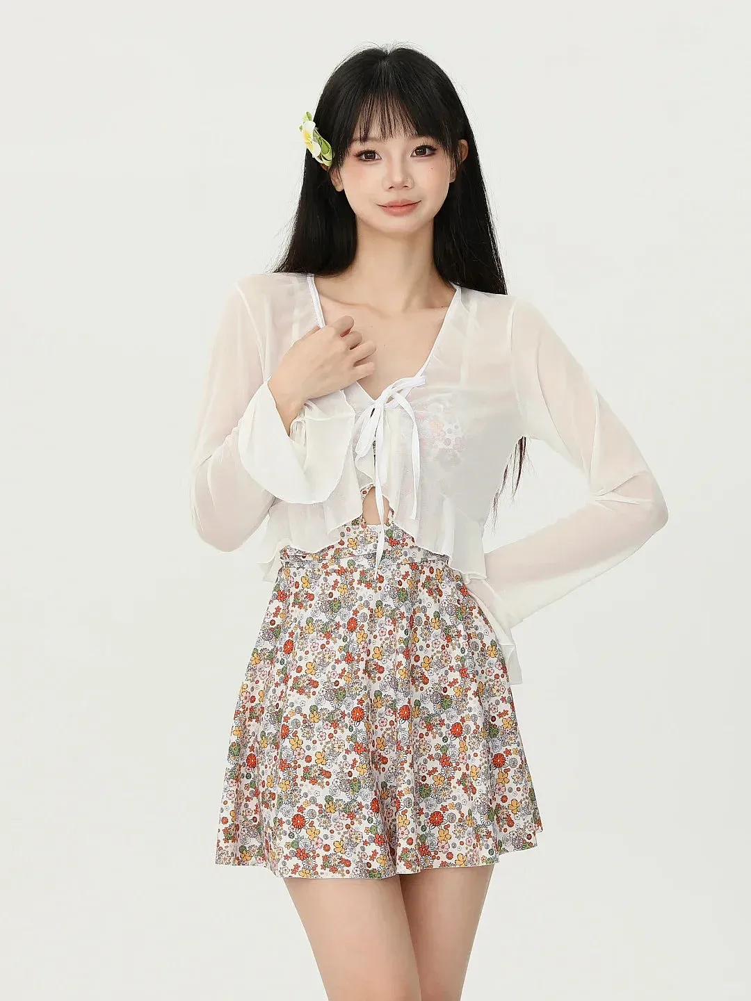最后这套碎花加薄罩衫,我看了半天,喜欢的不是花,而是那件半透明白衫把整个画面按住了。要是单穿碎花的话容易散开;加上了罩衫之后,花朵被一层雾气笼罩着,反而有一种呼吸的感觉。前几年我去海边的时候也试过类似的方式买亮色连体泳衣,在白天拍照时很热闹,到了晚上灯光一照整个人就黄了。后来换成了浅底小碎花的款式外面再套上一块白纱的照片中皮肤看起来干净很多就连我妈都说这次买的值。⏰